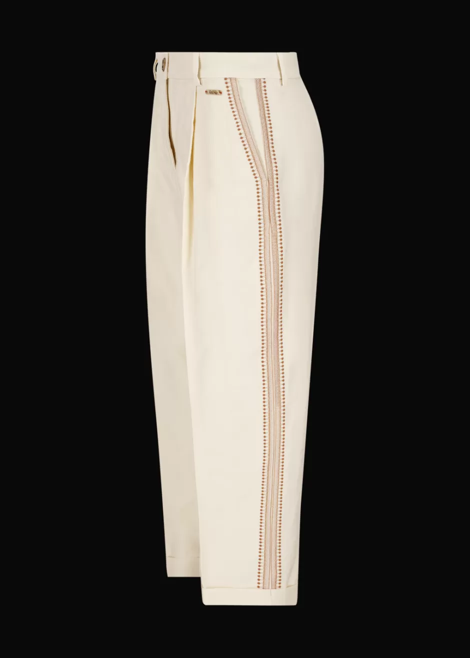 - Diese knöchellange Karottenhose im Comfort Fit mit geradem Bein, Saumumschlag und Bundfalten besteht aus einer strukturierten Baumwoll-Leinen-Mischung. Die gestickte Ethno-Bordüre entlang des Hosenbeins ist ein raffiniertes Detail, das sie besonders hervorhebt.