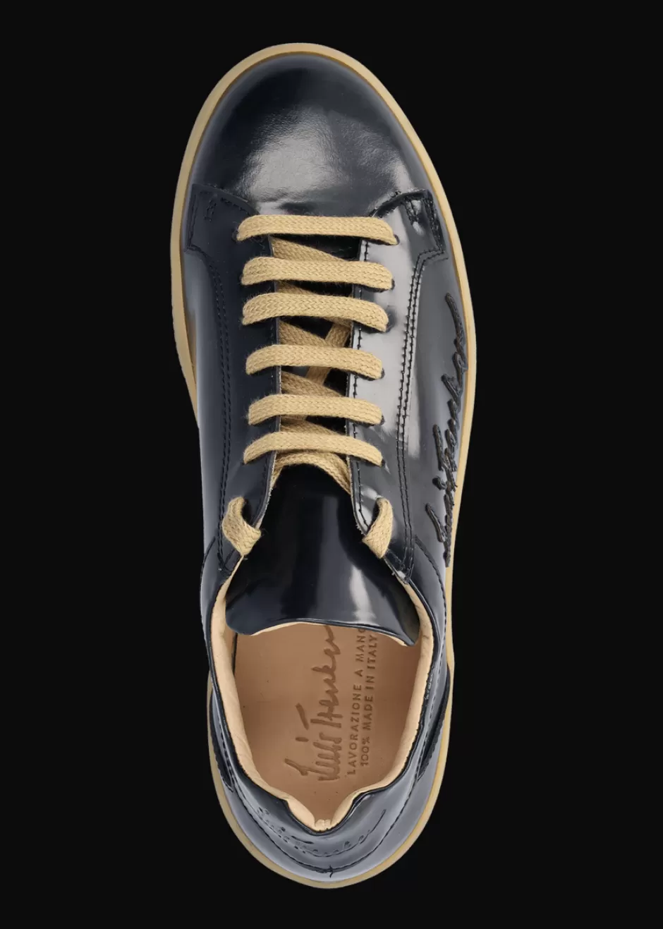 - Dieser handgefertigte Sneaker aus echtem Glattleder verleiht Deinem Look den nötigen Glanz. Die leicht erhöhte Gummisohle und die Innensohle aus weichem Leder sorgen für ganztägigen Komfort.