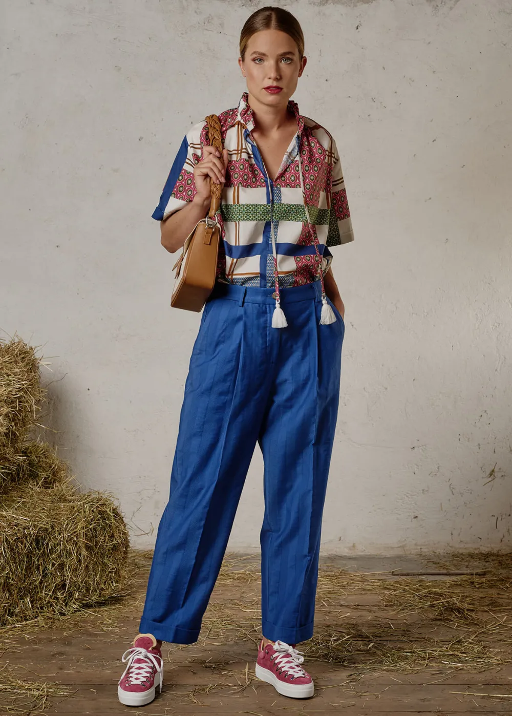 Besonderheiten: Angenehmer Mix aus den Naturfasern Baumwolle und Leinen, Bund- und Bügelfalten, Saumumschlag, Band im Folklore-Look innen am Bund, Logoplakette links am Bund - Unser Model Sophie ist 1,77 m groß und trägt Größe 42.