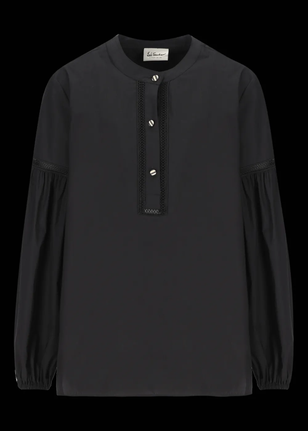 - Diese Bluse im Comfort Fit mit langen Ballonärmeln, Rundhalsausschnitt und kurzer Knopfleiste besteht aus reiner Baumwolle. Ihre Bordüre mit Lochstickerei an Knopfleiste und Ärmeln, sowie die mit Stoff überzogenen Knöpfe machen sie zu einem eleganten Basic.