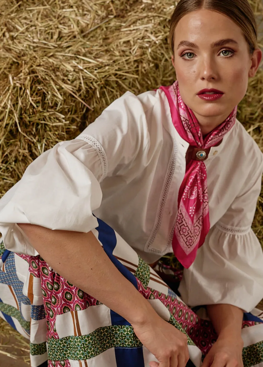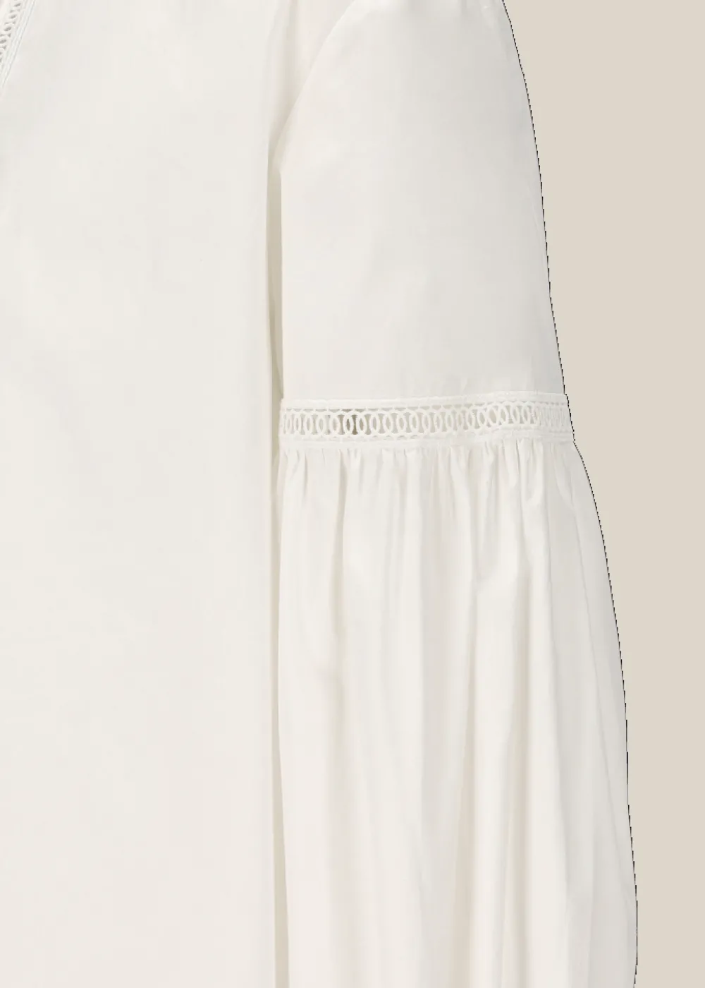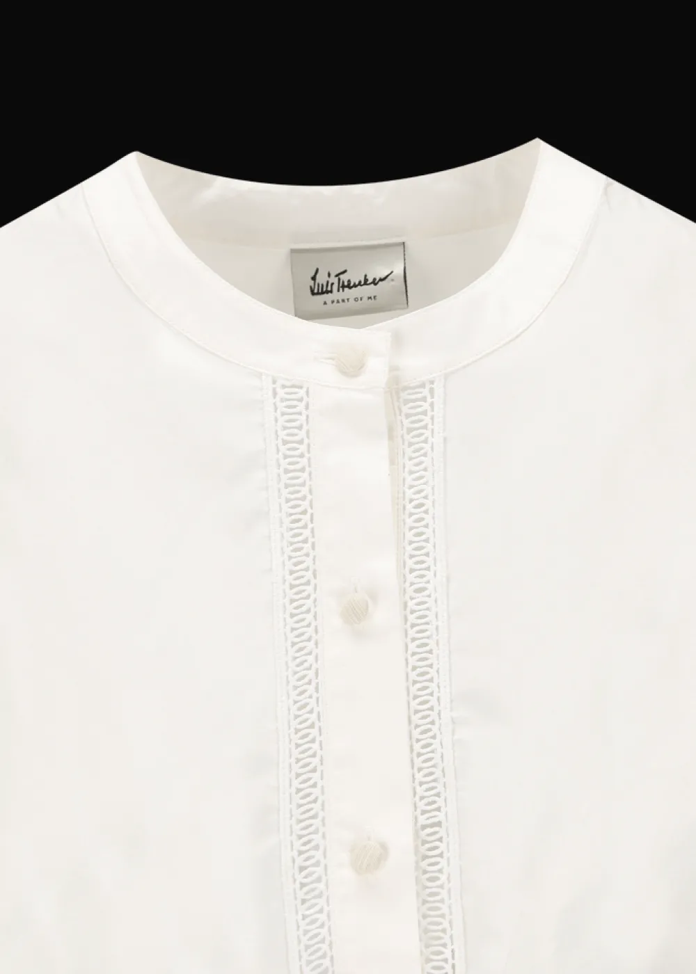 Besonderheiten: Feminine Ballonärmel mit elastischen Bündchen, zarte Lochstickerei, Knöpfe aus echtem Perlmutt - Unser Model Sophie ist 1,77 m groß und trägt Größe S.