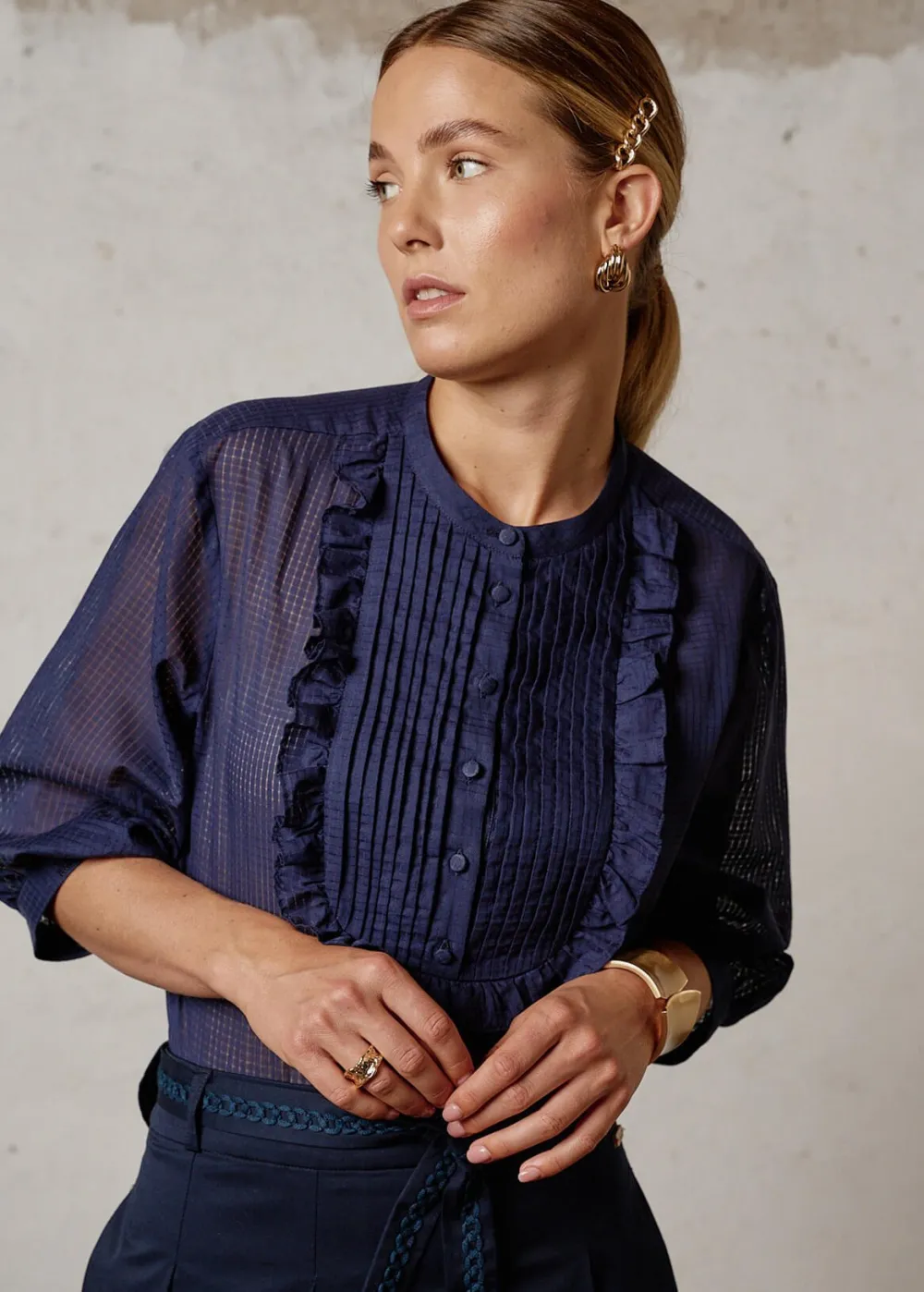 Besonderheiten: Weite Dreiviertelärmel, plissiertes Plastron mit Rüschen, mit Stoff überzogene Knöpfe - Unser Model Sophie ist 1,77 m groß und trägt Größe S.