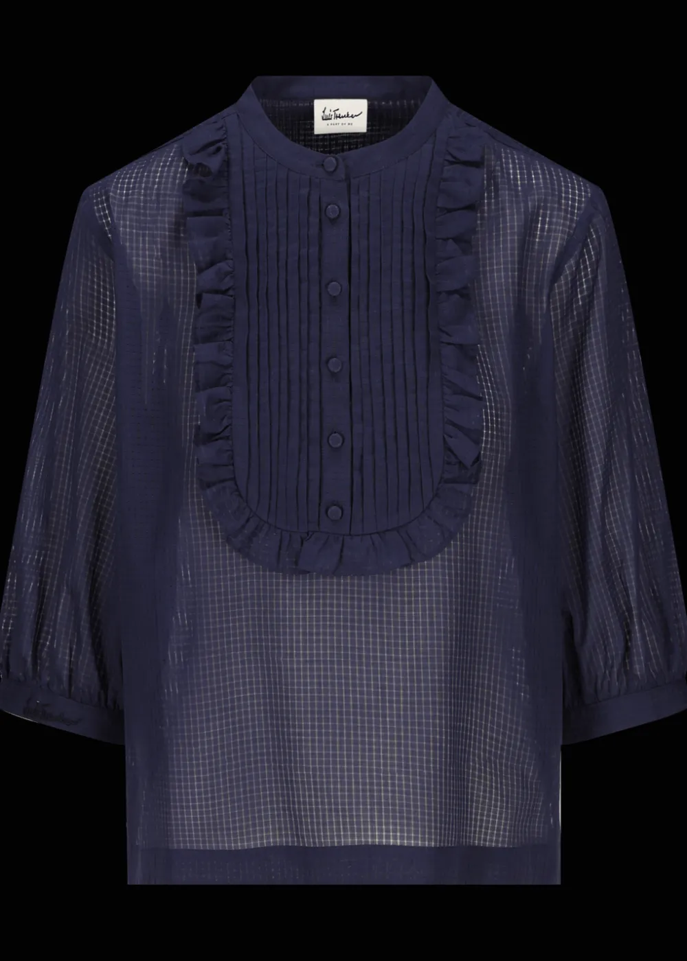 - Diese Bluse im Comfort Fit mit Rundhalsausschnitt und weiten Ärmeln in Dreiviertellänge besteht aus einem leichten, transparenten Baumwollstoff. Das plissierte Plastron mit Rüschensaum und die mit Stoff überzogenen Knöpfe an der kurzen Knopfleiste sind die Details, die sie auszeichnen.