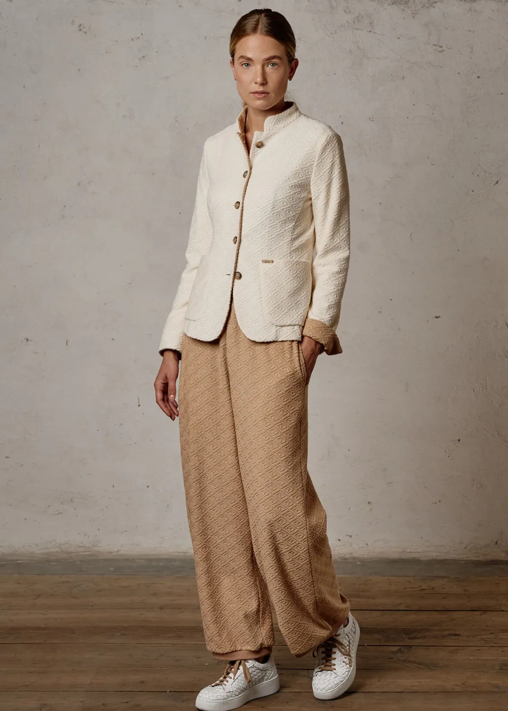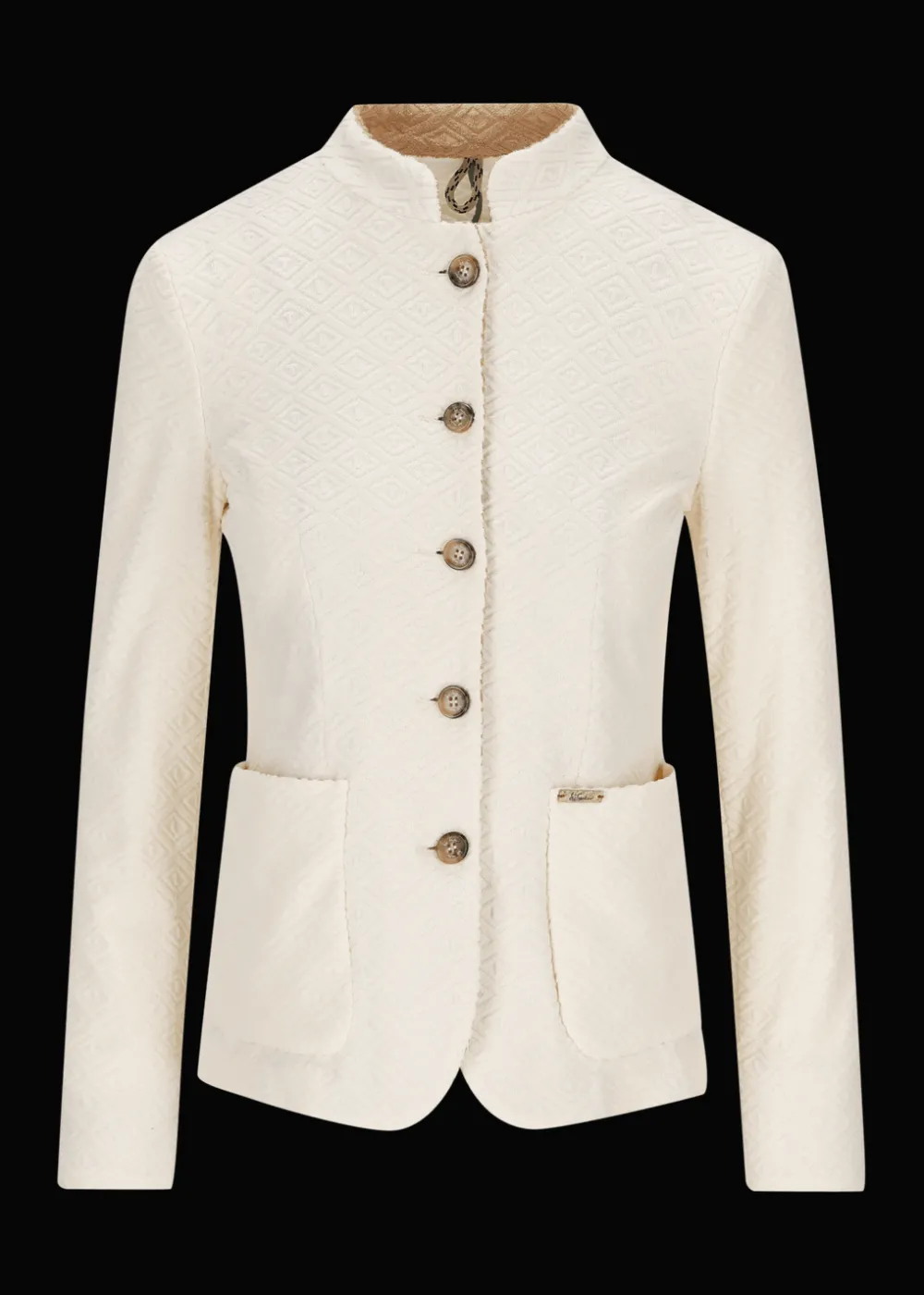 - Dieser ungefütterte Blazer im Comfort Fit mit Stehkragen und einreihiger 5-Button-Front besteht aus Baumwolle und Nylon, verarbeitet zu einem bequemen Jersey-Frottee mit exklusiv für Luis Trenker entworfenem All-Over Rautenmotiv aus den Initialen LT.
