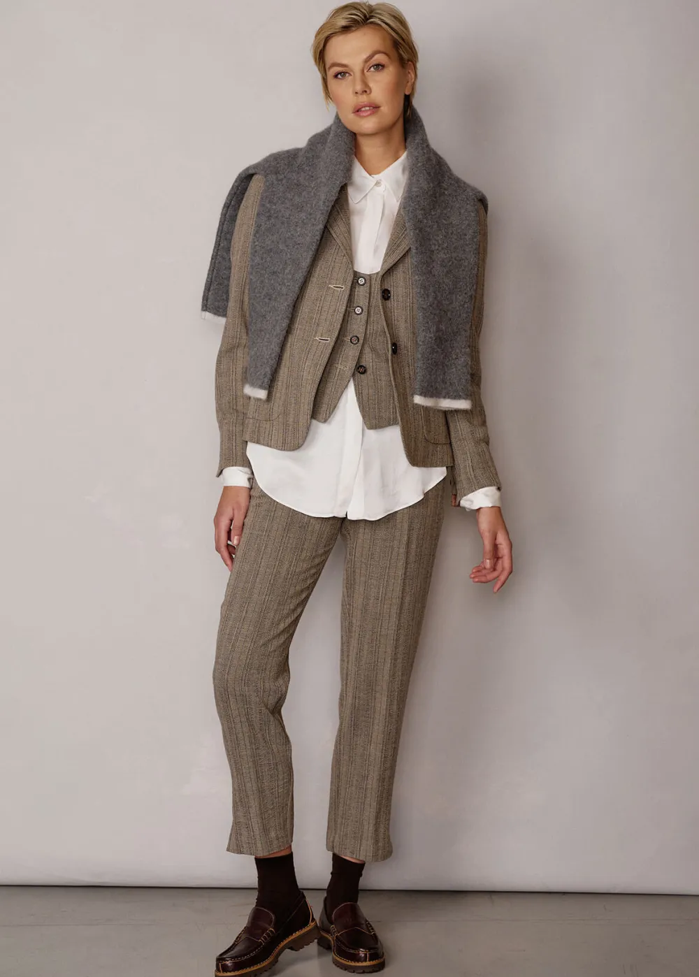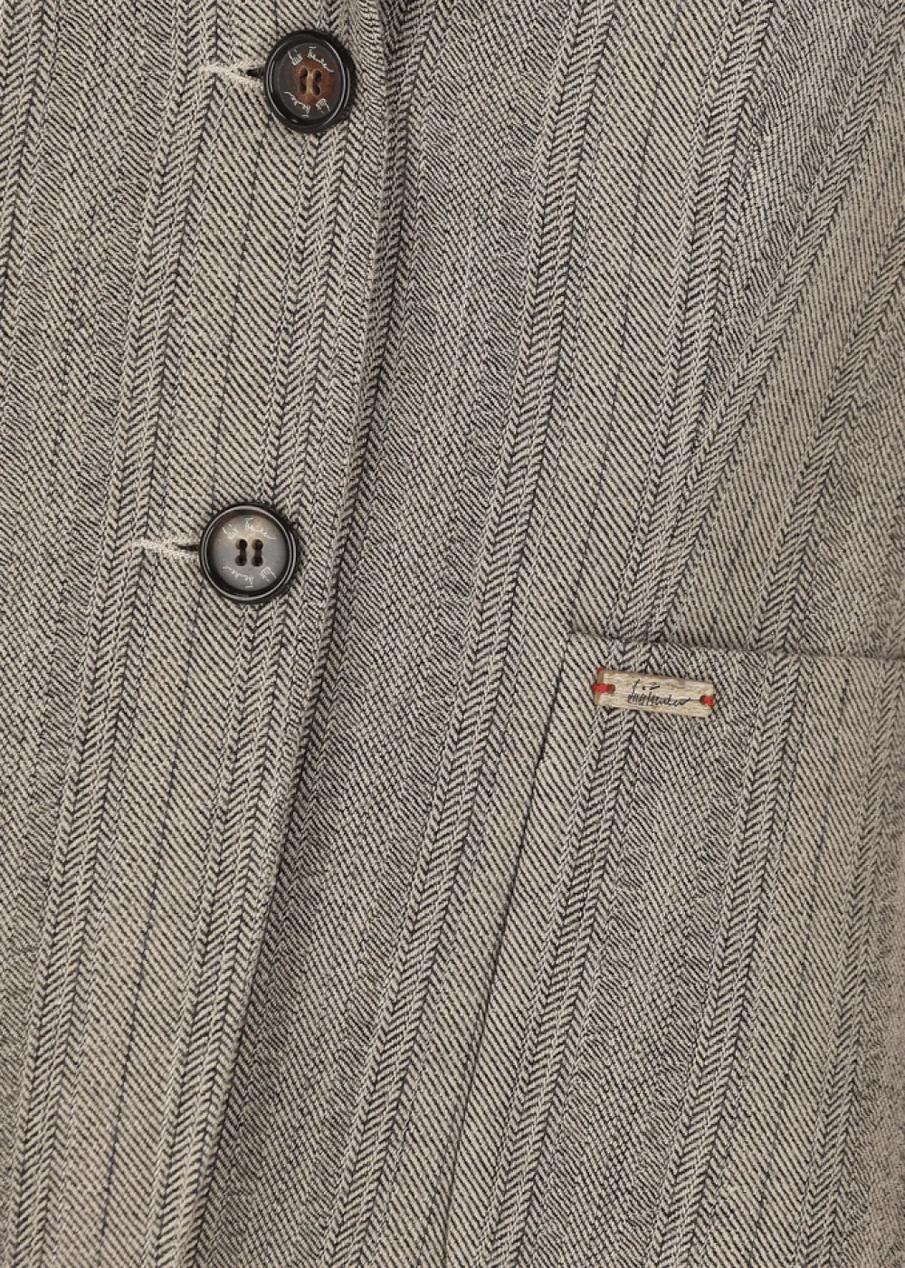 Besonderheiten: Angenehme Mischung aus Baumwolle und Schurwolle, extra Tragekomfort, klassisches Fischgrät-Jacquard, personalisiertes Jacquardband als Jackenaufhänger und an der Innenseite der Manschetten, Logoplakette in Hornoptik an der linken Tasche - Unser Model Chantal ist 1,78 m groß und trägt die italienische Größe 42.