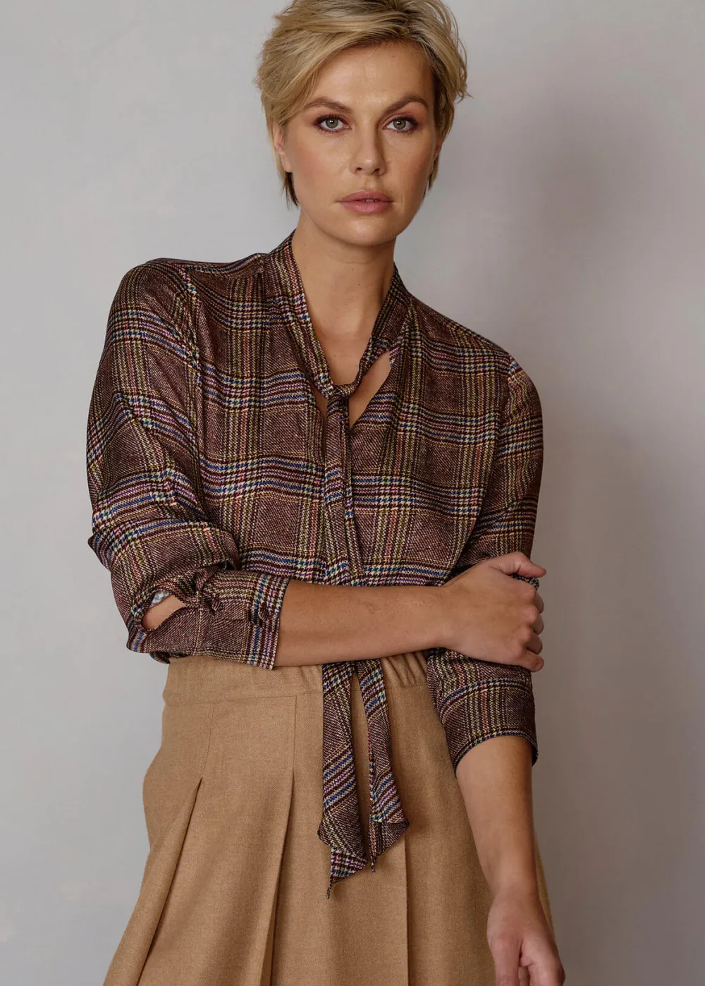 Besonderheiten: Reine Viskose für ein angenehmes Tragegefühl, eleganter Prince of Wales Print, mit Stoff überzogene Knöpfe an den Manschetten - Unser Model Chantal ist 1,78 m groß und trägt Größe S.