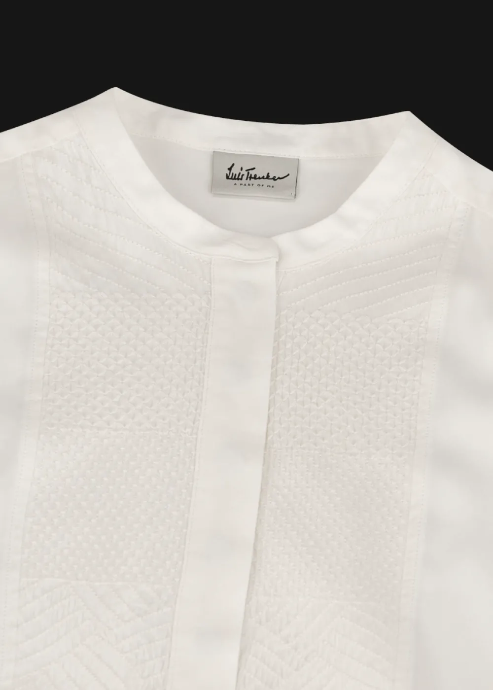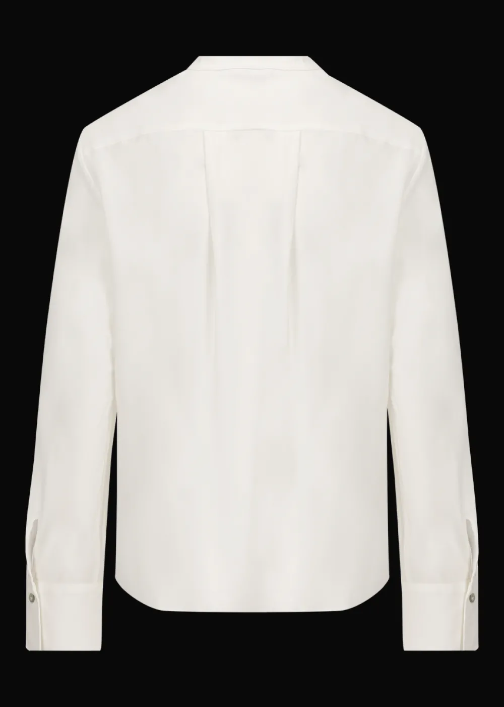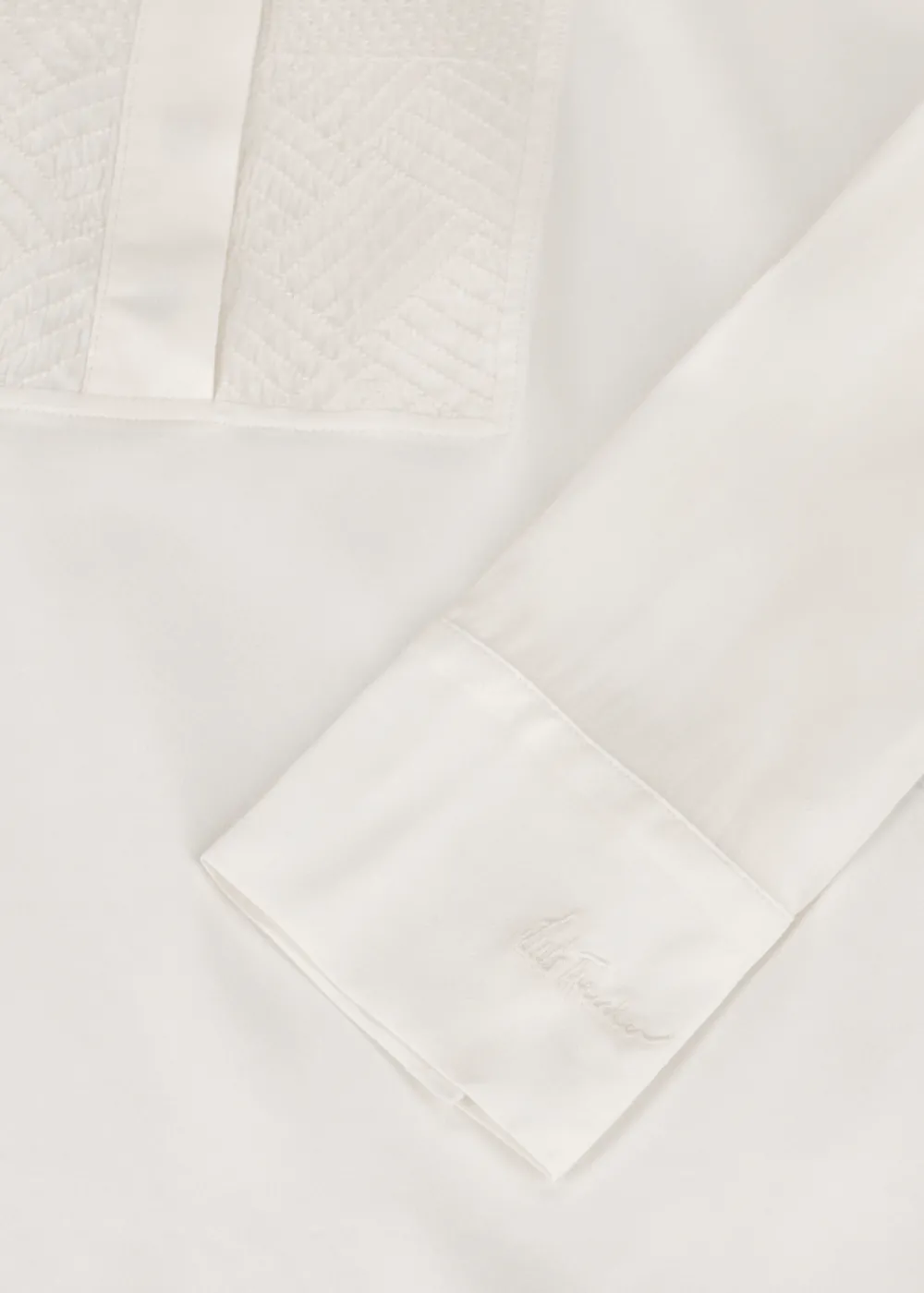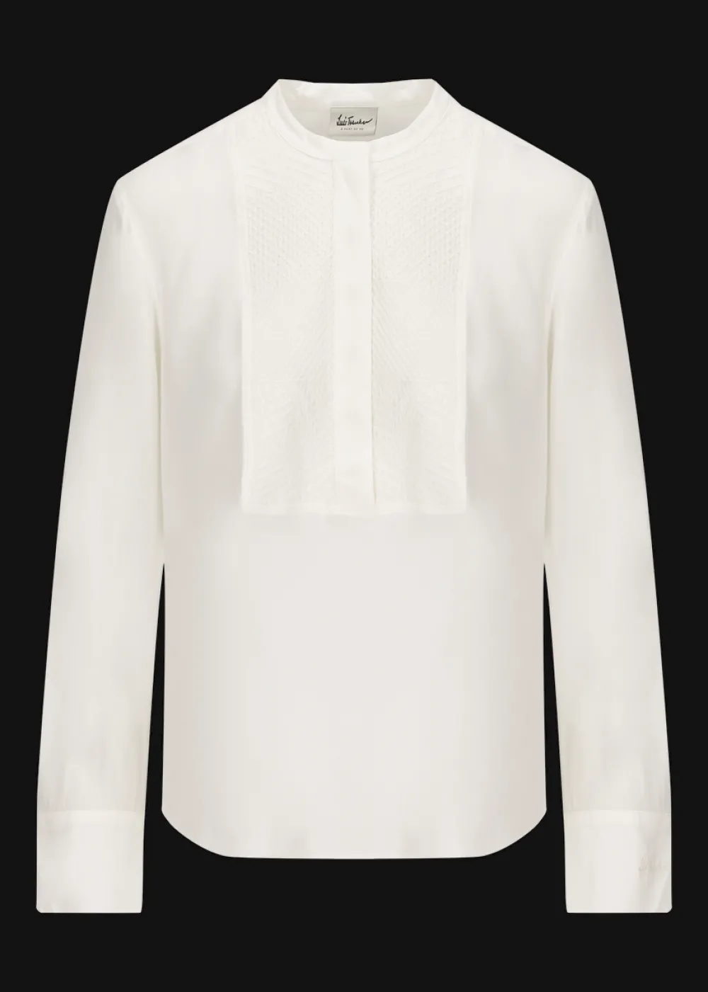 Knopfleiste: Kurze verdeckte Knopfleiste mit Knöpfen aus echtem Perlmutt - Besonderheiten: Stückgefärbtes Seidenmischgewebe, besticktes Plastron, seitliche Schlitze