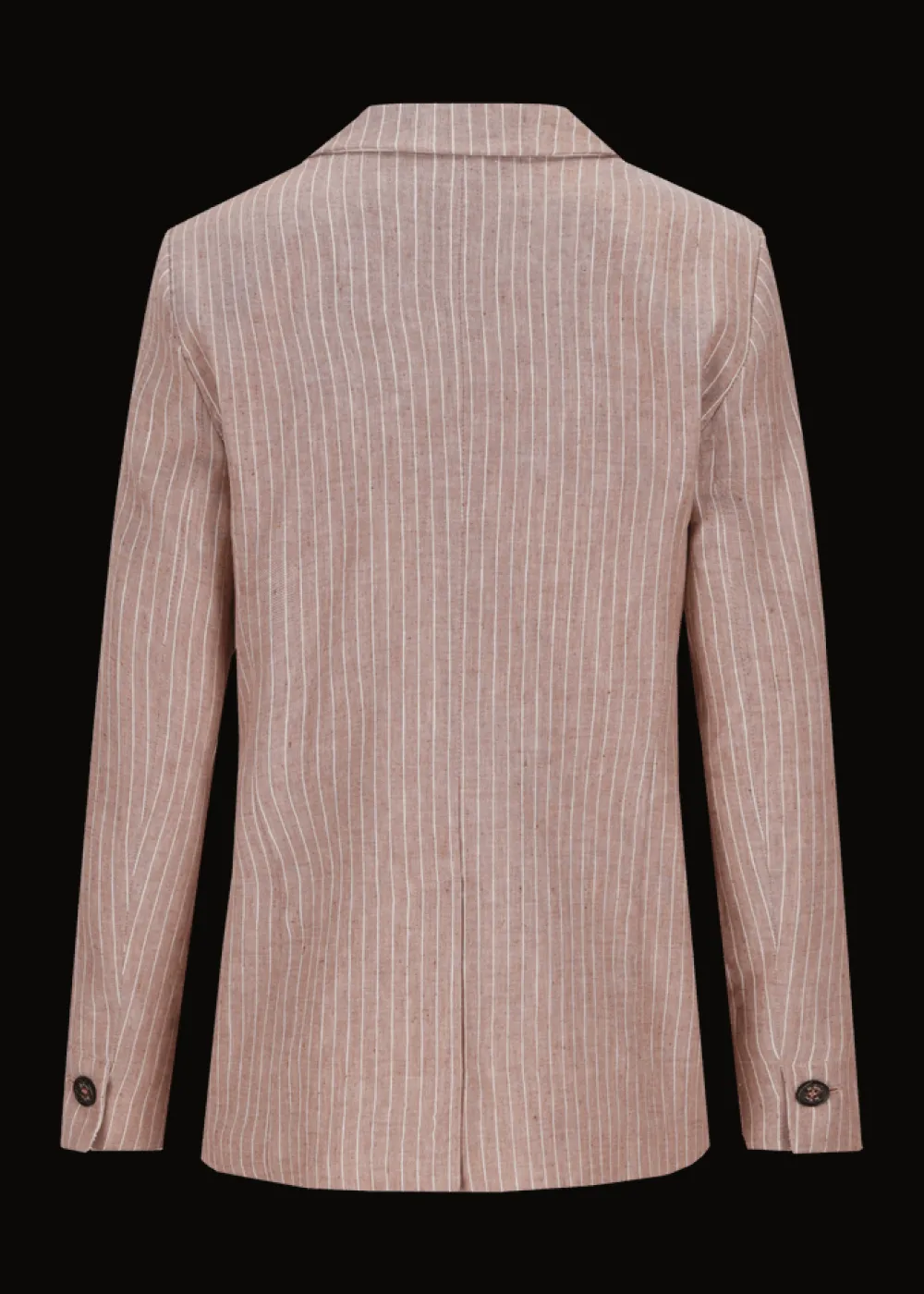 - Dieser halbgefütterte, etwas länger geschnittene Blazer im Regular Fit mit Reverskragen und doppelter Knopfleiste besteht aus einer angenehmen Mischung aus Leinen und Baumwolle mit Nadelstreifen.
