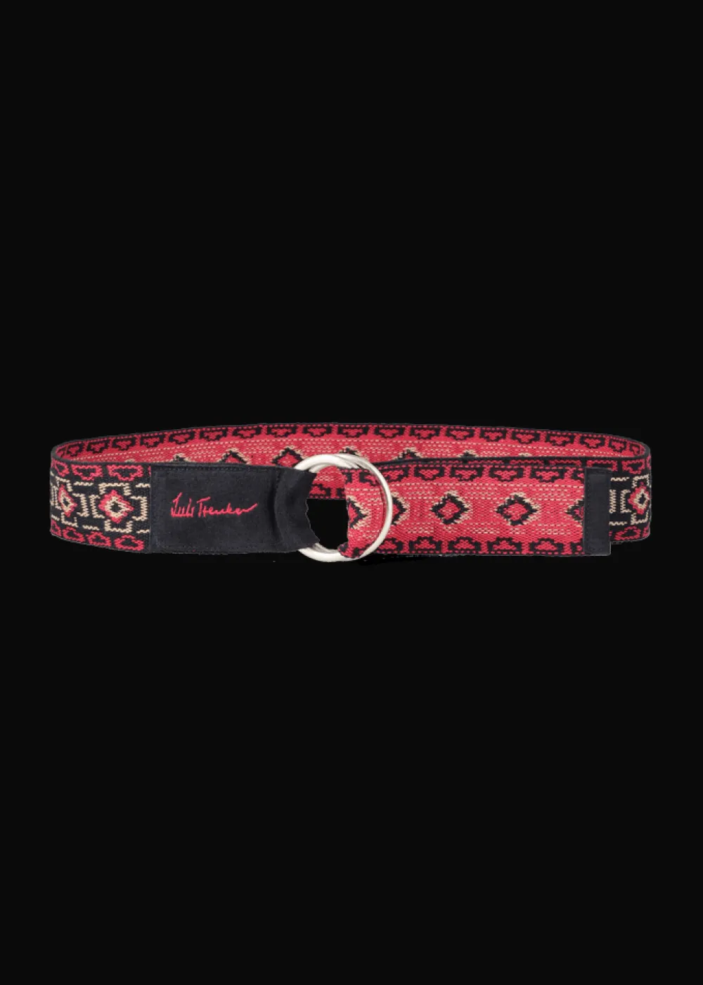 - Dieser Gürtel aus Baumwolle mit gewebtem, exklusiv für Luis Trenker designtem Ethnomotiv wird mit zwei metallischen Ringen geschlossen. Der Wildlederbesatz mit gesticktem Luis Trenker Logo in Kontrastfarbe ist ein zusätzliches, hochwertiges Detail.