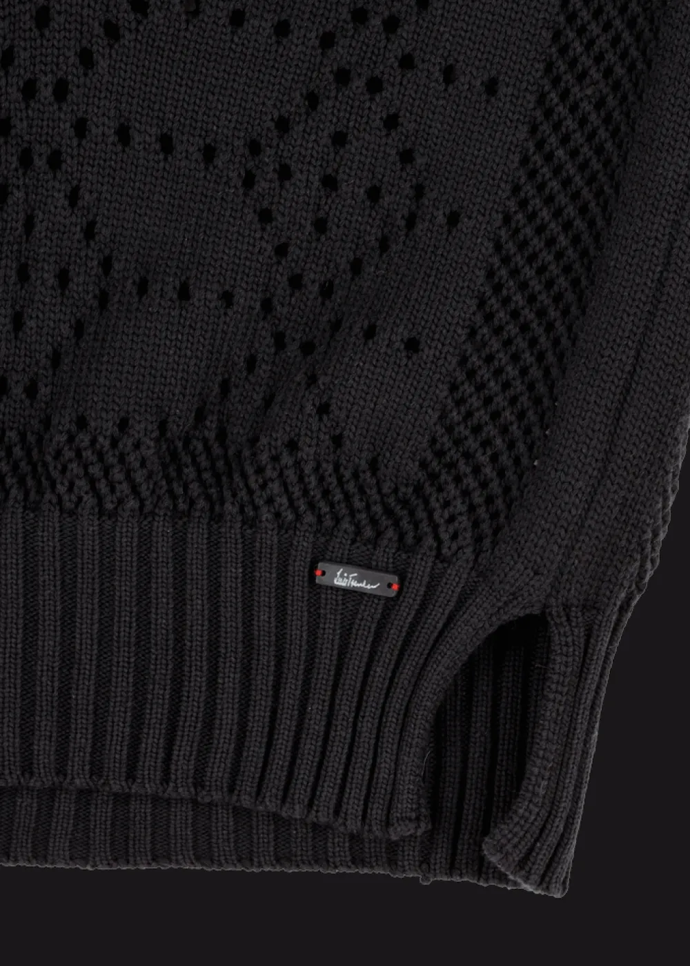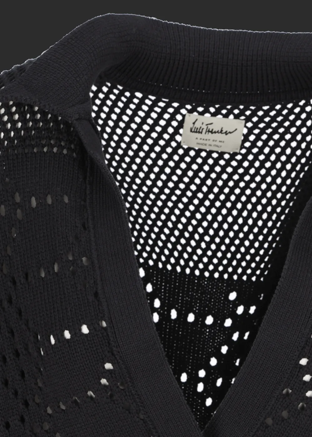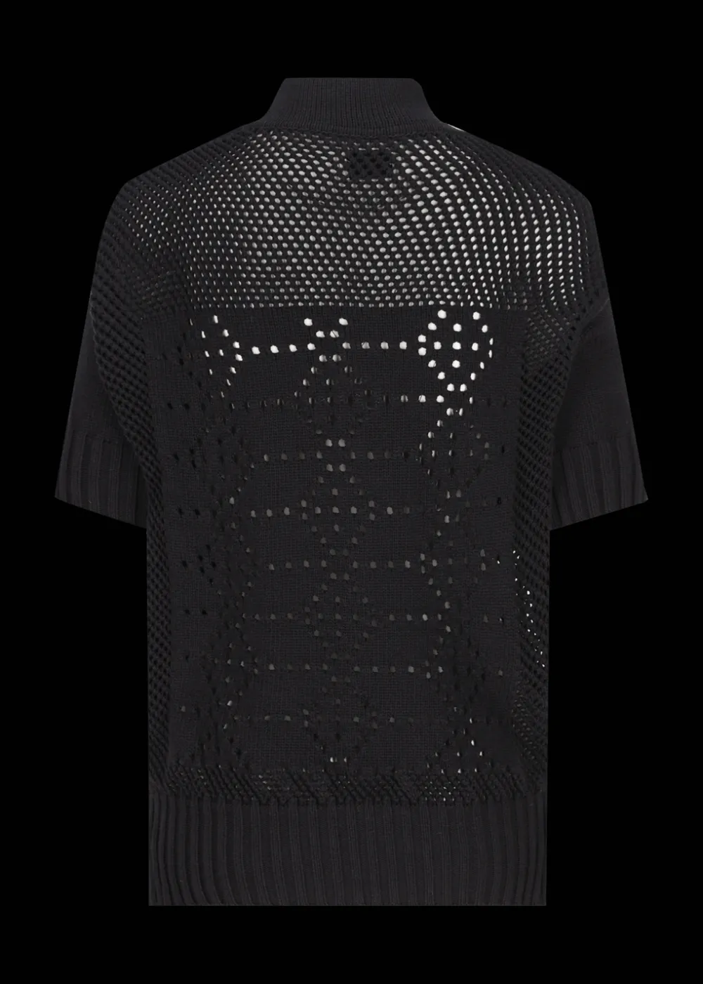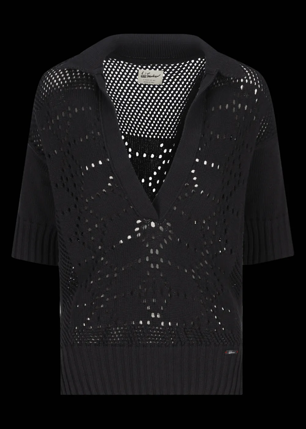 Herkunft: In Italien gefertigt - Besonderheiten: Feminines Lochmuster, Ärmel in Dreiviertellänge, Seitenschlitze, gerippt an Saum und Ärmelabschluss, Logoplakette links am Saum
