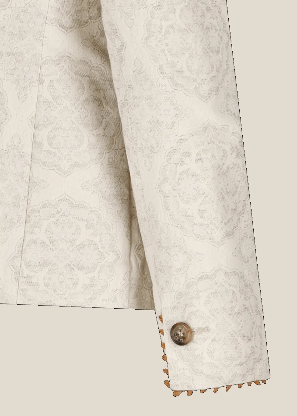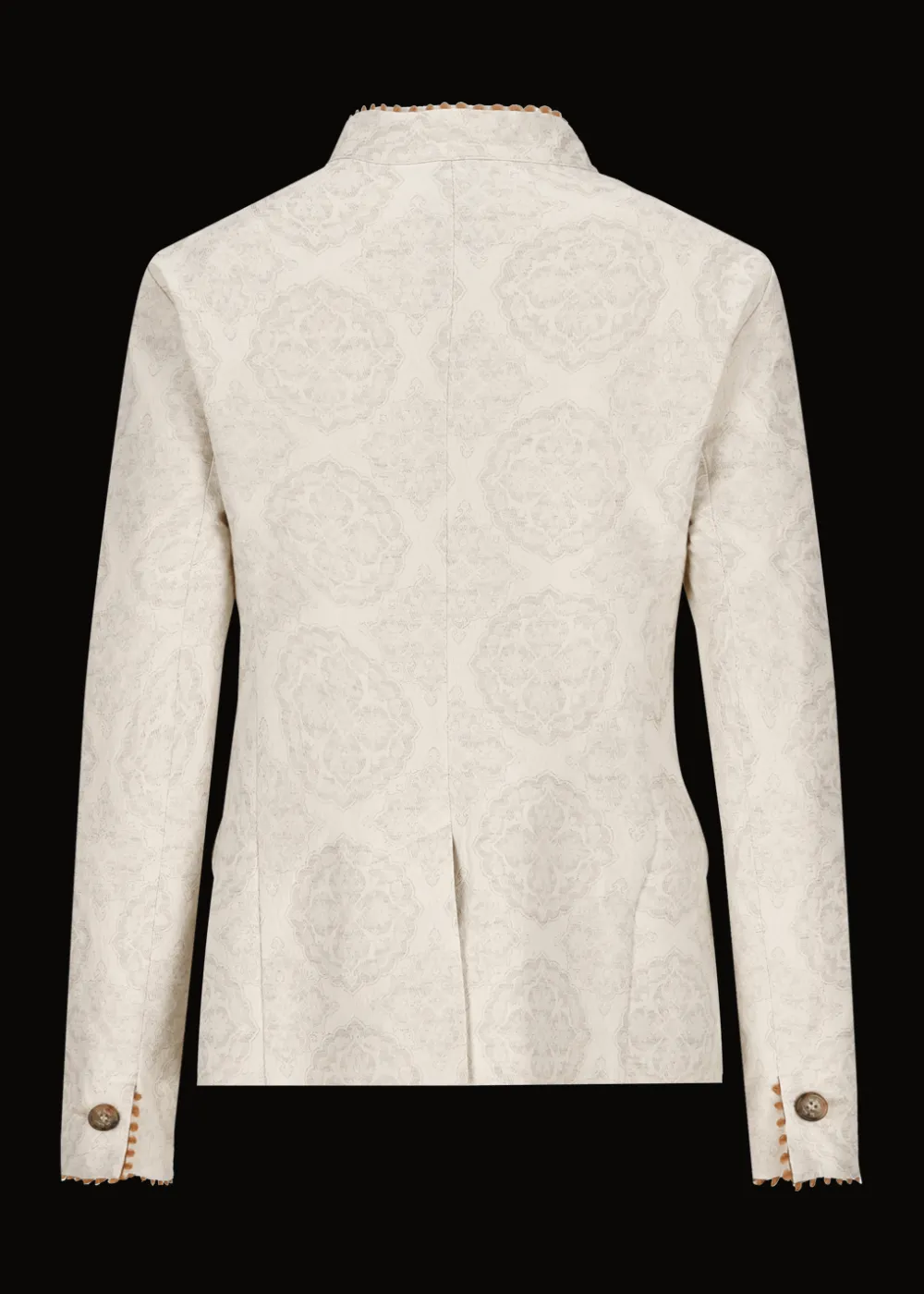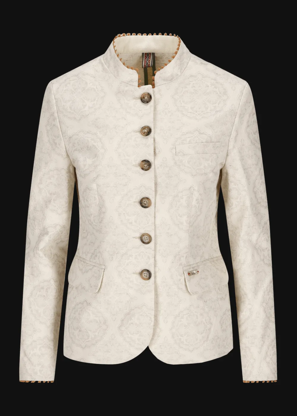 Besonderheiten: Edles Baumwoll-Leinen-Jacquard mit floralem Muster, Piqué als Kontraststoff innen, dekorative Stickerei mit kleinen Schlaufen an Kragen und Handgelenken, Band im Folklore-Look als Jackenaufhänger, Logoplakette an der linken Tasche - Unser Model Sophie ist 1,77 m groß und trägt Größe 42.