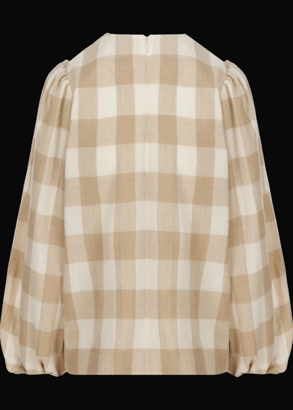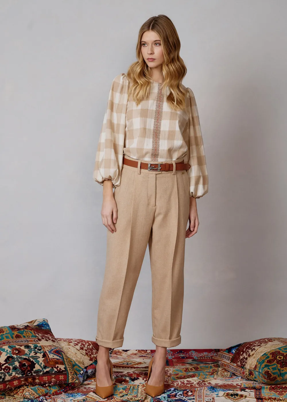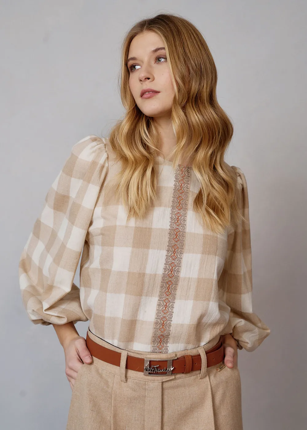 - Diese Bluse aus reiner Schurwolle mit Buffalo-Karomuster und Rundhalsausschnitt bekommt durch ihre Ballonärmel mit betonter Schulter und gerafften Bündchen, sowie ihre Ethno-Stickerei vorne einen verspielt-femininen Charakter.
