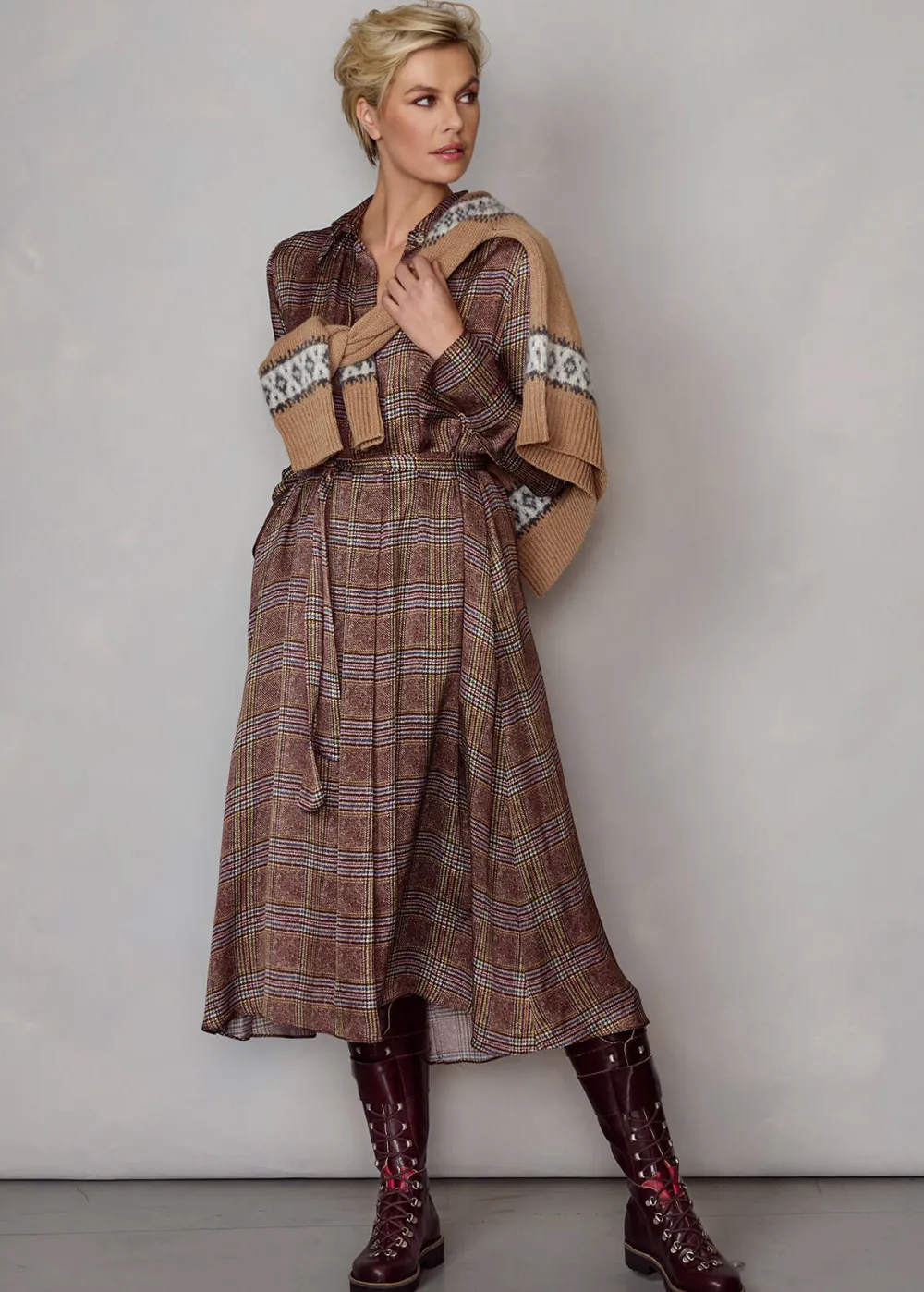 - Dieses lange, ungefütterte Kleid im Comfort Fit mit französischem Kragen, langen Ärmeln und kurzer, verdeckter Knopfleiste besteht aus reiner Viskose mit zeitlosem Prince of Wales Print. Der passende Gürtel zum Knoten oder zum Binden einer Schleife betont die Taille und schenkt dem Kleid feminine Eleganz.