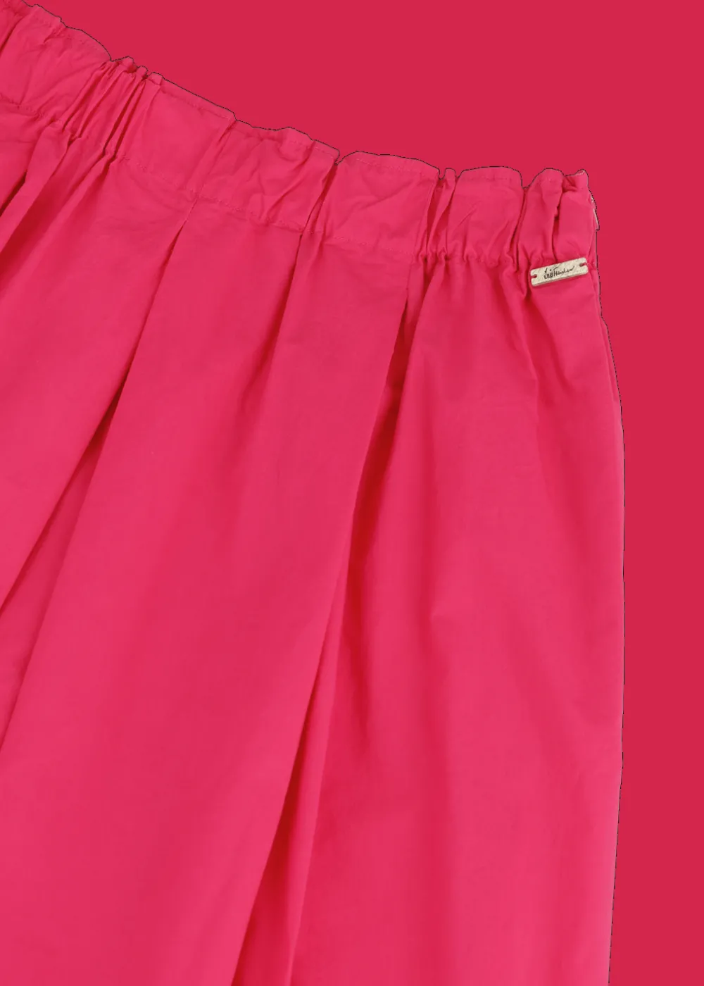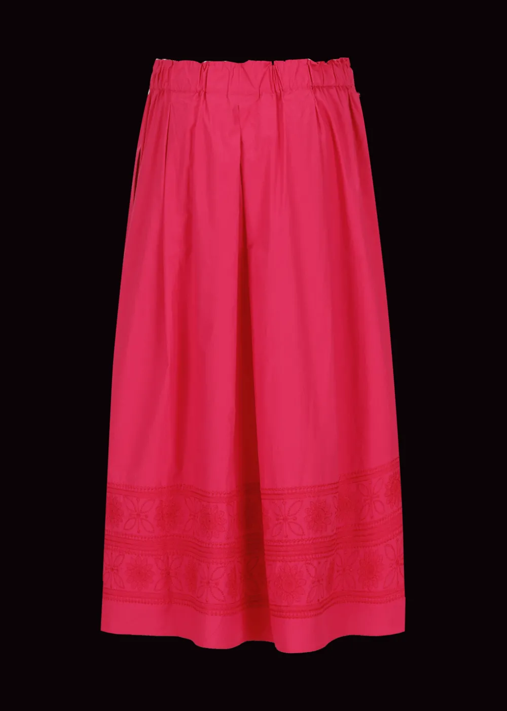 Futter: Ungefüttert - Besonderheiten: Reine Baumwolle in besonders leichter Qualität, elastischer Bund, figurumschmeichelnde Falten vorne und hinten, detailreiche Stickerei am Saum, Logoplakette in Hornoptik links am Bund