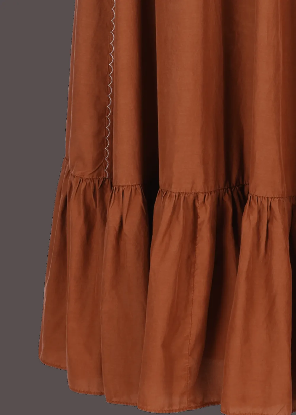 Futter: Ungefüttert - Besonderheiten: Stückgefärbter Seiden-Baumwoll-Mix, elastischer Bund, abnehmbare Träger, Saum mit Volants, gestickte Bordüre