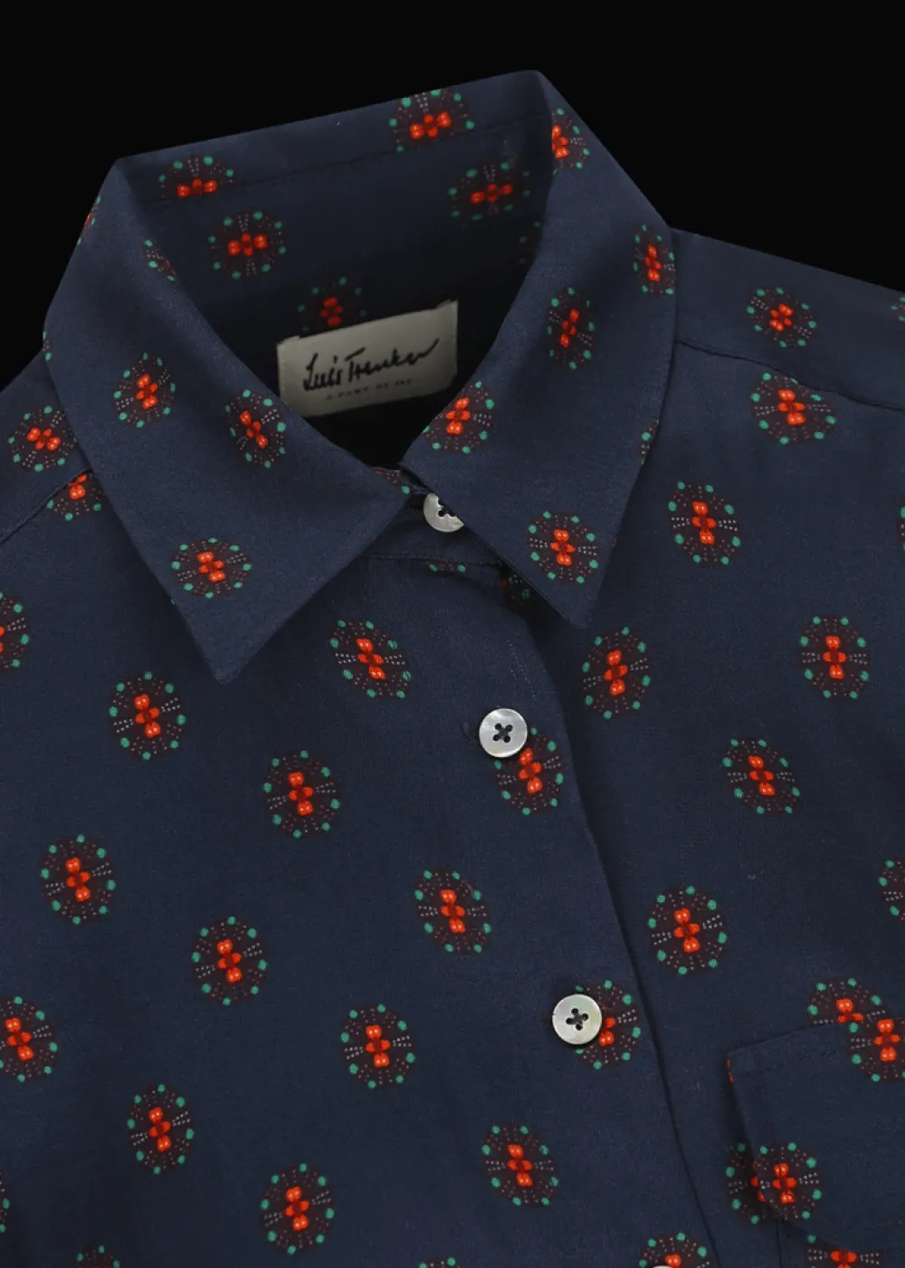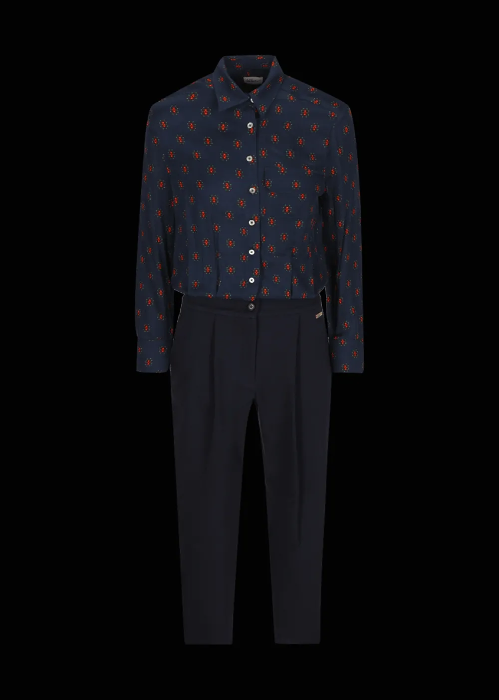 Taschen: Zwei seitliche Eingrifftaschen, eine Paspeltasche am Gesäß - Besonderheiten: Extra Tragekomfort, Bluse mit echten Perlmuttknöpfen, Hose mit Knopf aus Bio-Horn, Logoplakette in Holzoptik links am Hosenbund