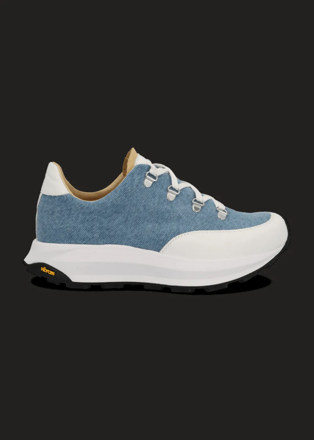 - Dieser Sneaker mit ergonomischer Vibram-Plateausohle überzeugt mit der Kombination von hochwertigem Glattleder in zeitlosem Creme und blaugrauem Baumwollcanvas.