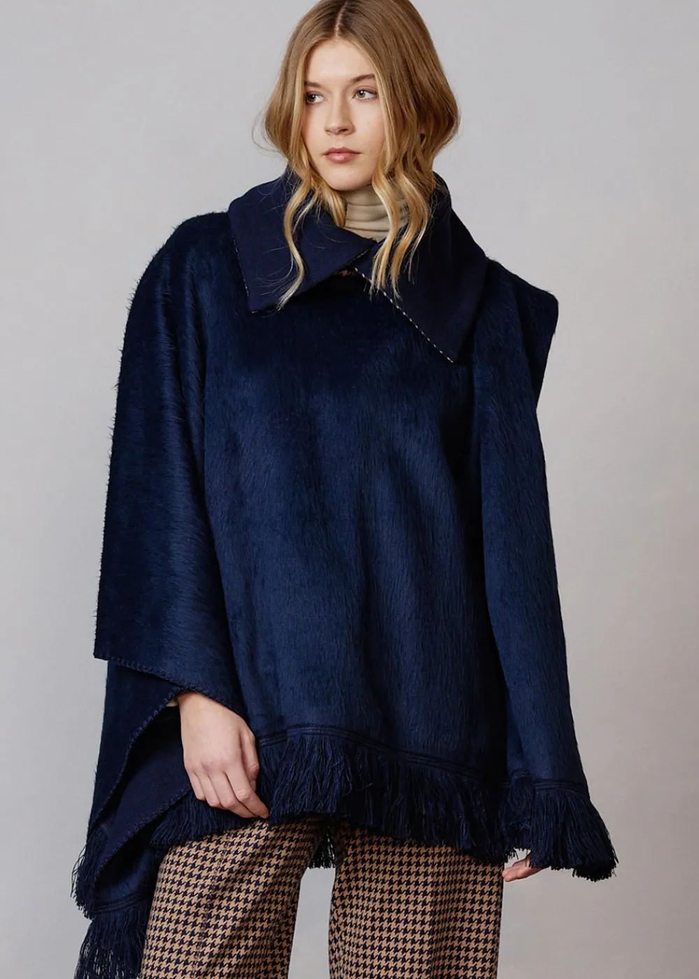 - Dieser kuschelige Poncho hat zwei Seiten: Innen besteht er aus reiner Wolle für optimale Wärmeisolation, außen aus einem Mischfaser-Kunstpelz für eine unvergleichlich flauschige Haptik. Er hat einen breiten Jerseykragen mit Hahnentrittmuster, durch den Du besonders schnell und einfach mit dem Kopf schlüpfen kannst.