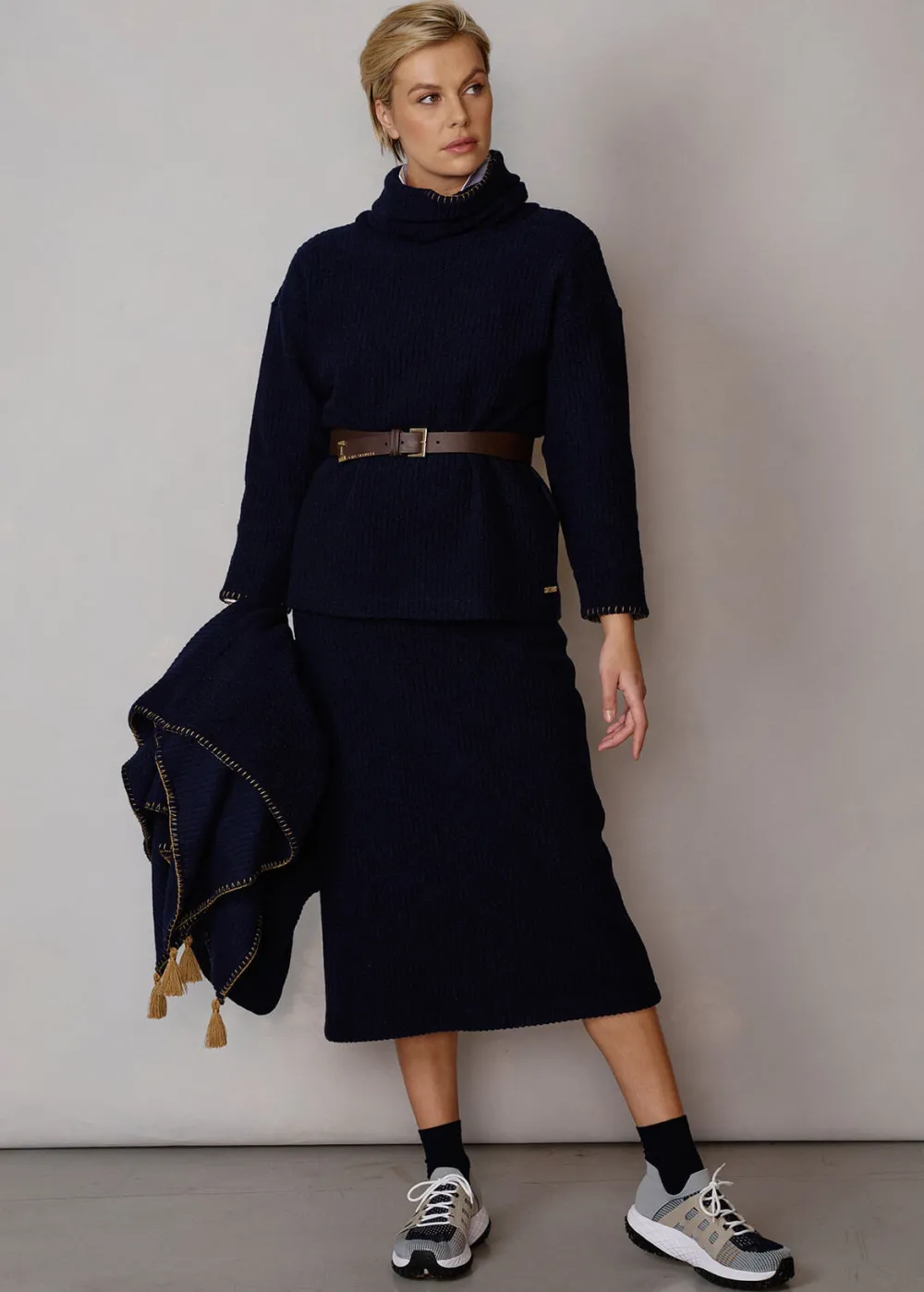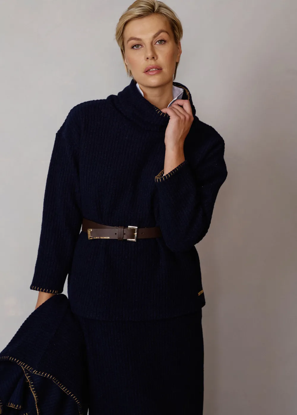 Besonderheiten: Schurwolljersey mit extra Tragekomfort, dekorative Stickerei im Schlingstich in Kontrastfarbe an Kragen und Ärmelabschluss, Logoplakette in Hornoptik links am Saum - Unser Model Chantal ist 1,78 m groß und trägt Größe S.
