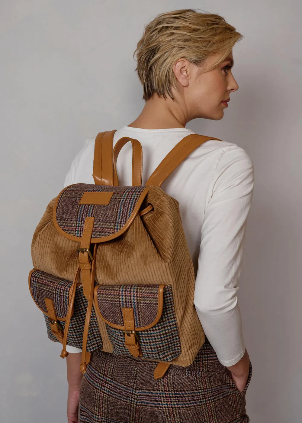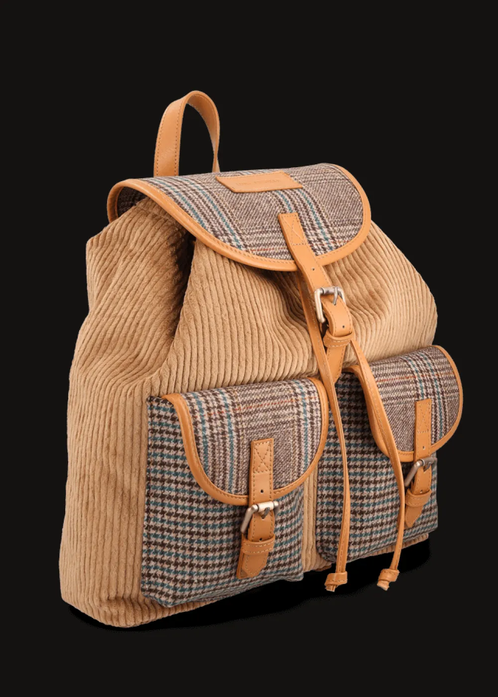 - Dieser geräumige Rucksack besteht aus Cord und zeichnet sich durch seine praktischen Magnetverschlüsse, sowie die beiden Kontraststoffe mit Hahnentrittmuster und Prince of Wales Muster aus. Er wird in Italien gefertigt und bietet genügend Platz für alles, was Du unterwegs brauchst.
