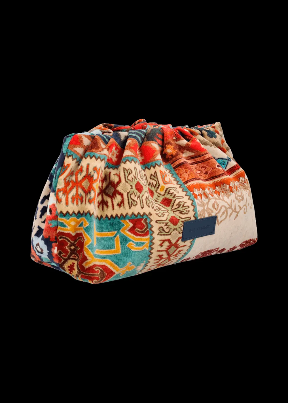 - Diese Clutch aus weichem Samt mit extravagantem, eigens für Luis Trenker entworfenen Patchwork-Muster verleiht selbst monochromen Basic-Looks den nötigen Farbtupfer.