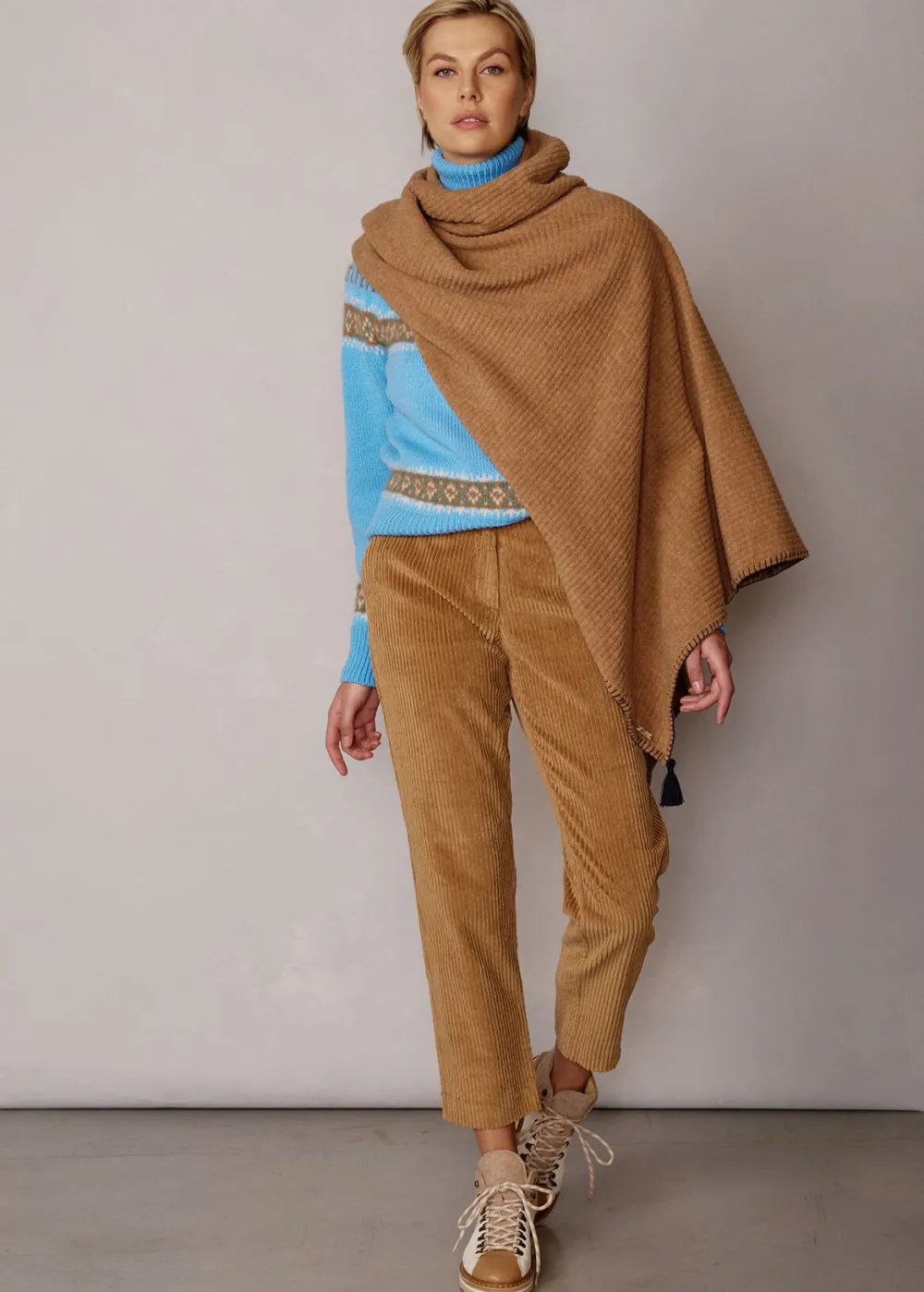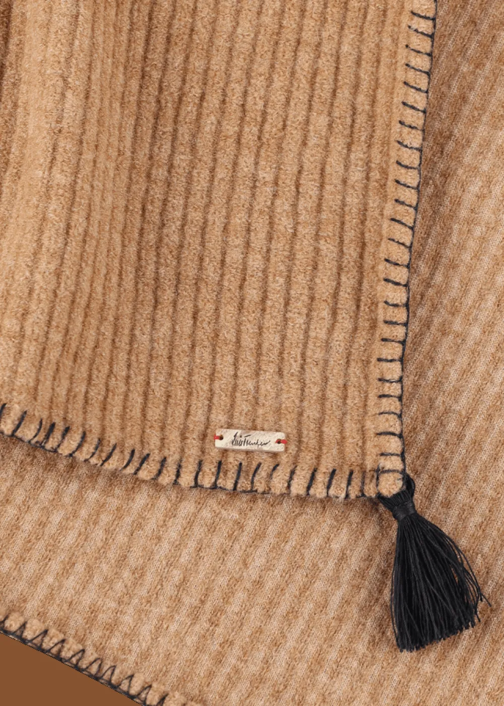 Besonderheiten: Verspielte Bommel aus Wolle an den Ecken, raffinierter Stickstich in Kontrastfarbe entlang des Saums