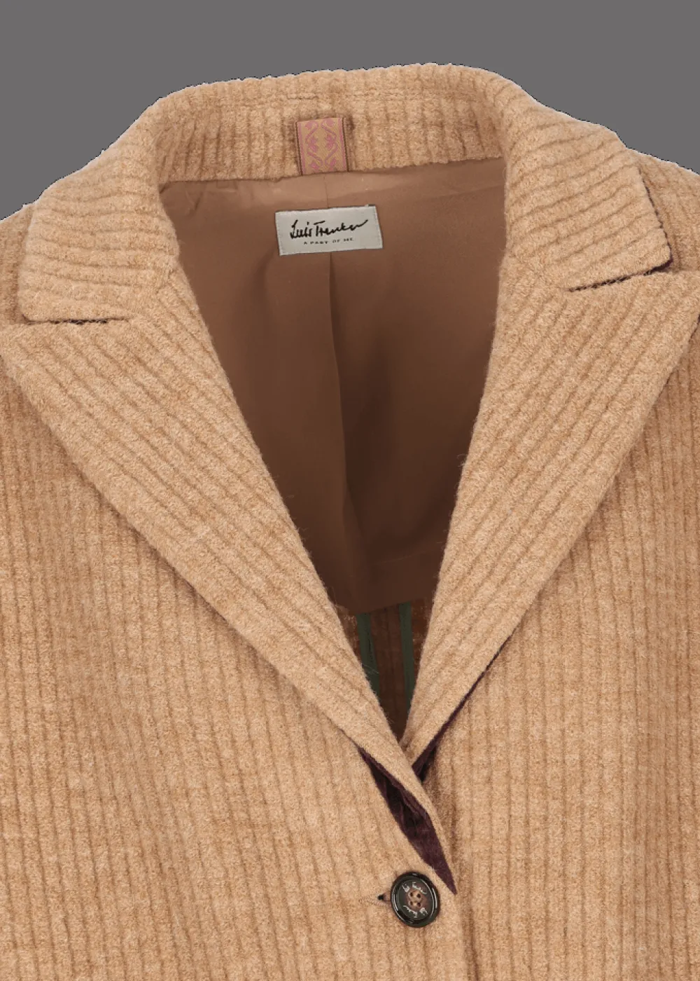 Besonderheiten: Cord als Kontraststoff an der Unterseite des Kragens und innen an den Manschetten, personalisiertes Jacquardband als Jackenaufhänger, Logoplakette in Hornoptik an der linken Tasche - Unser Model Chantal ist 1,78 m groß und trägt die italienische Größe 42.
