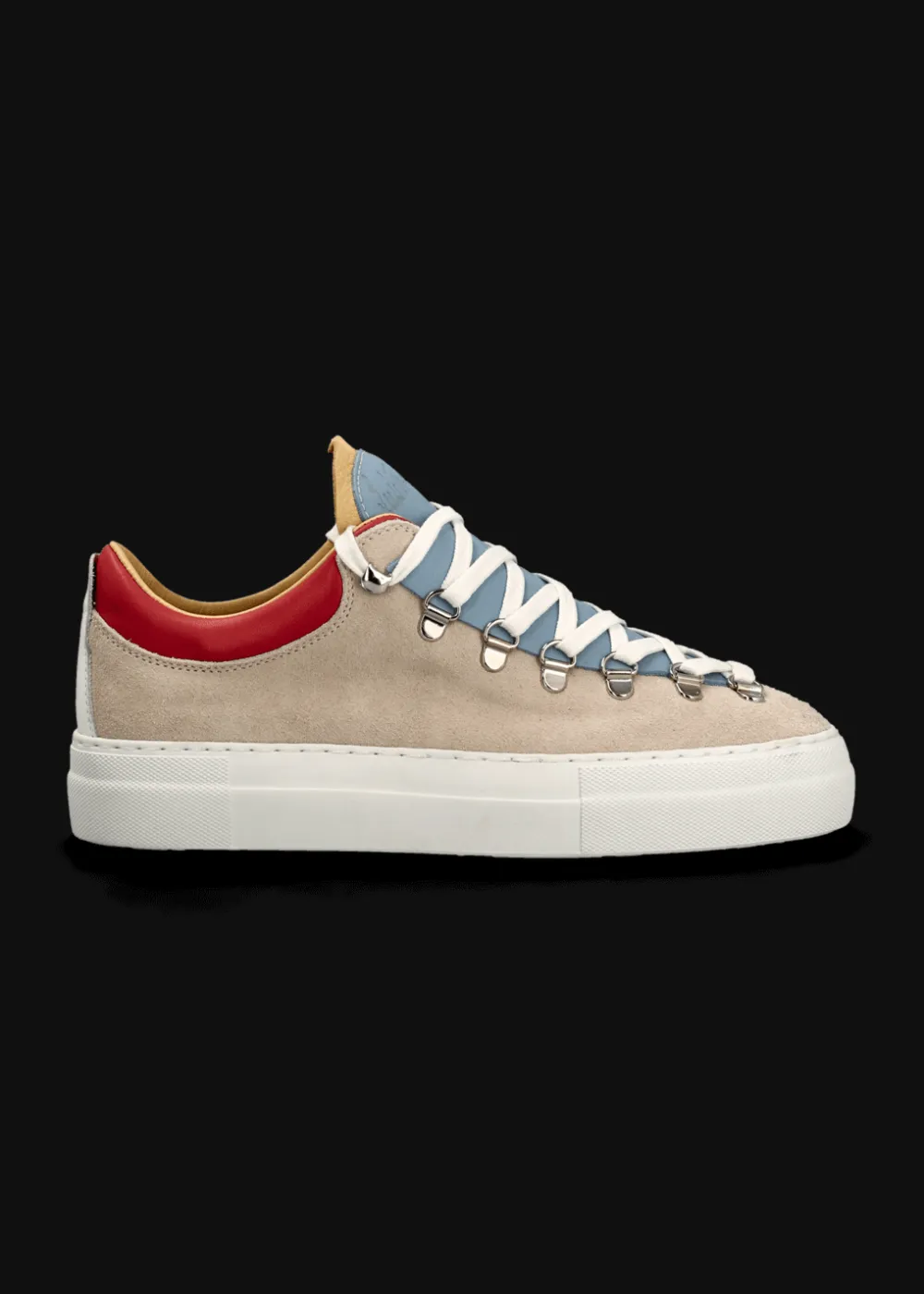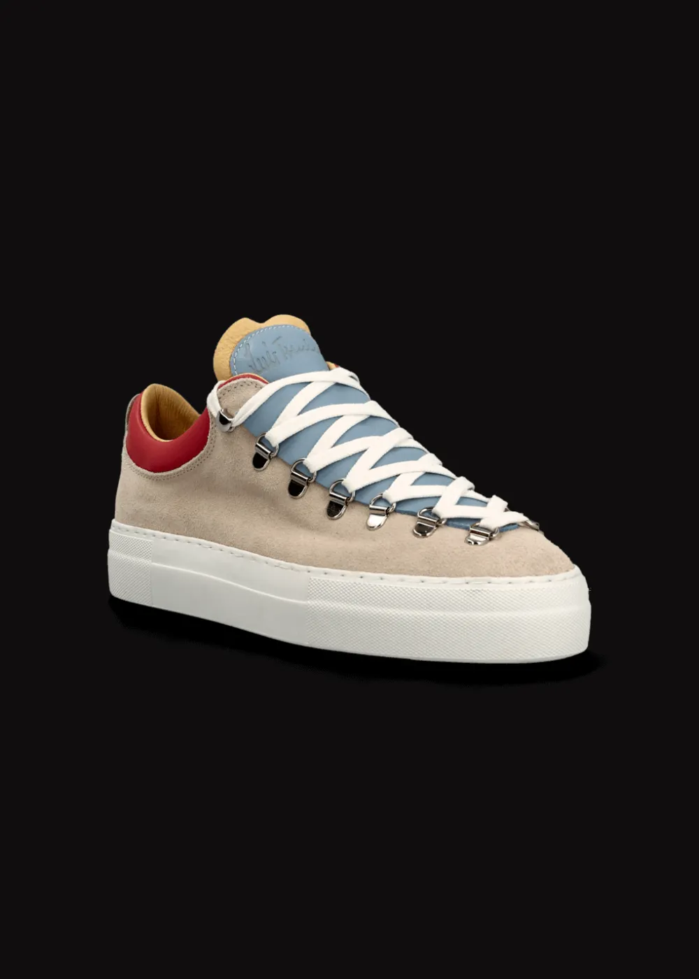 - Dieser Sneaker mit Plateausohle wurde aus feinstem Wild- und Nappaleder in Italien von Hand gefertigt. Die metallischen Ösen im Bergschuh-Stil verleihen ihm alpinen Charme, die atmungsaktive Kork-Innensohle sorgt für unvergleichlichen Komfort.