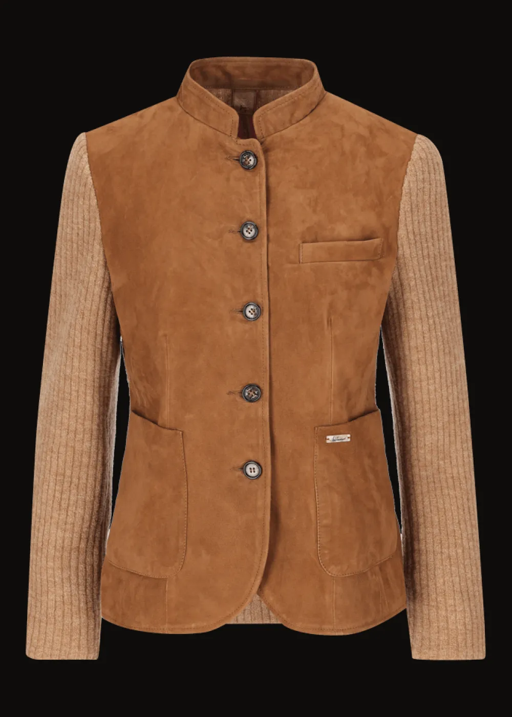 - Dieser halbgefütterte Blazer im Regular Fit mit Stehkragen besteht vorne aus echtem Ziegenwildleder, während der Rücken und die Ärmel aus Schurwolle im Rippstrick gefertigt sind. Ein spannender Materialmix, der frischen Wind in jede klassische Garderobe bringt.