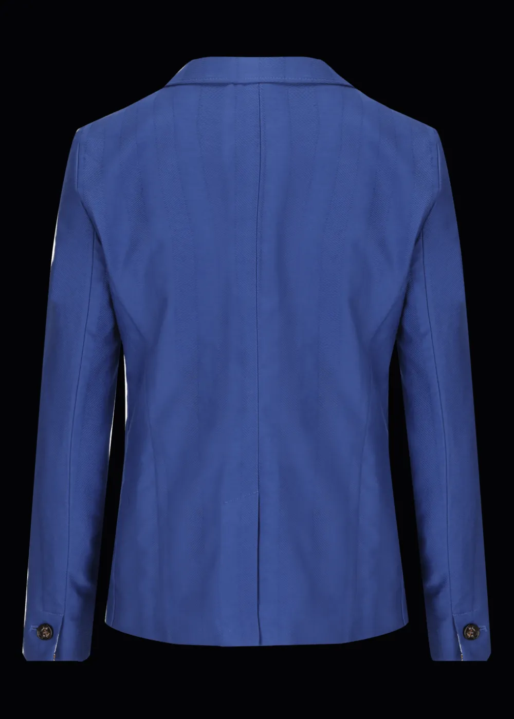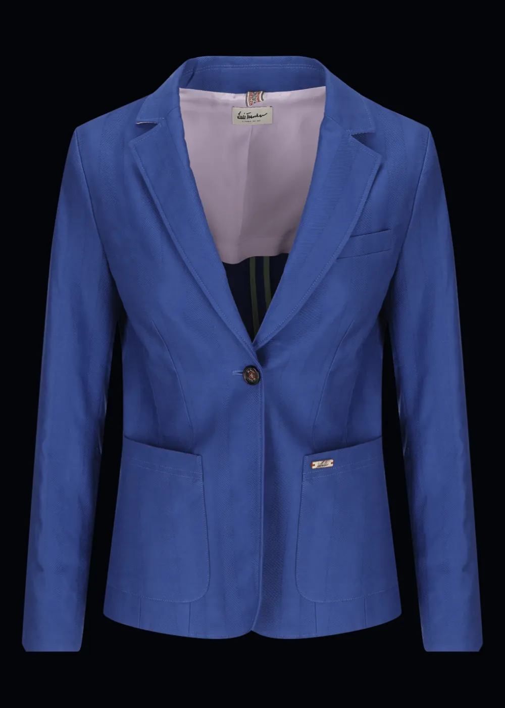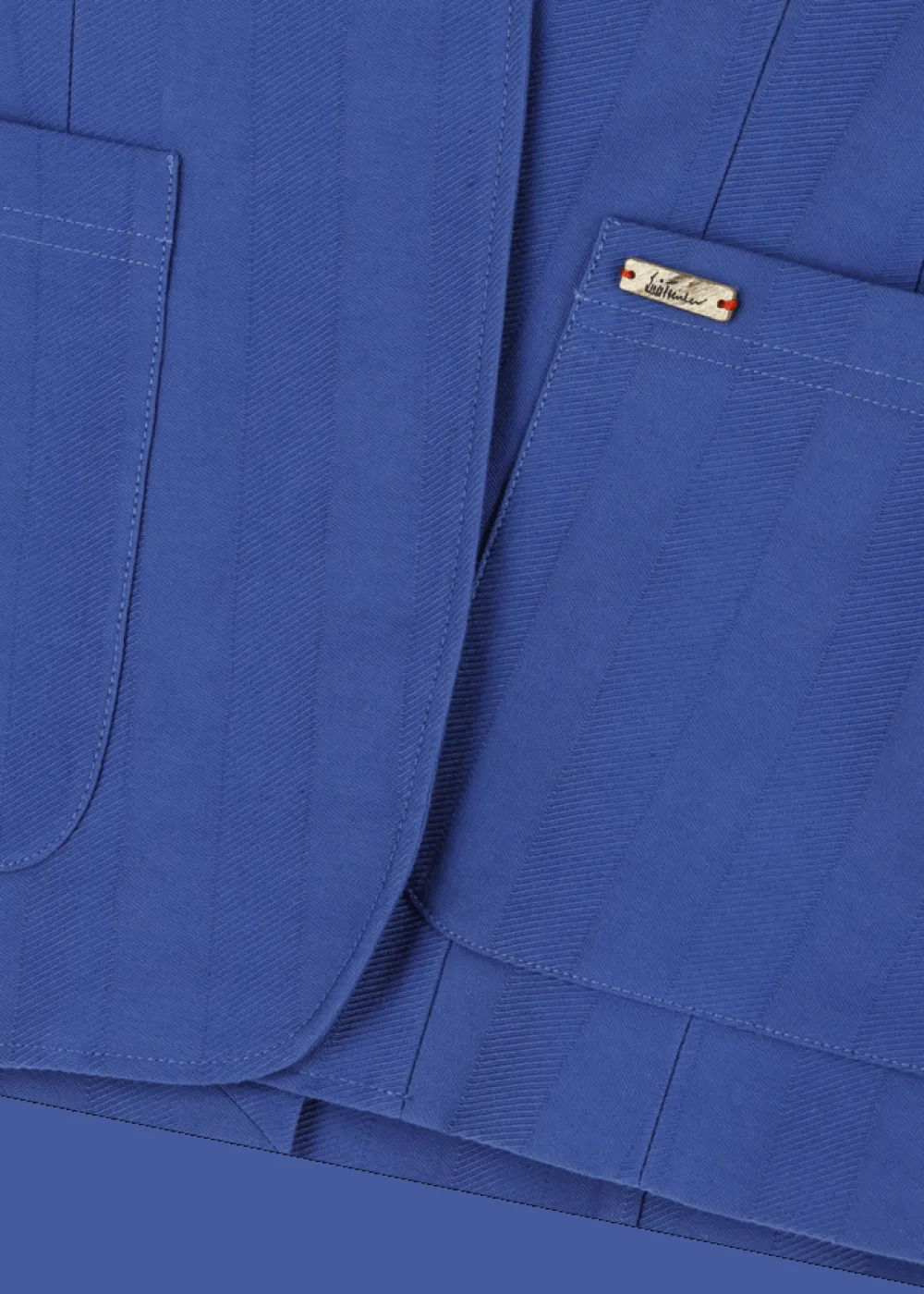 Futter: Halbgefüttert - Besonderheiten: Hochwertige Mischung aus den Naturfasern Baumwolle und Leinen mit Streifenstruktur im Fischgrätmuster, Rückenschlitz, Band im Folklore-Look als Jackenaufhänger und innen am Handgelenk, Logoplakette in Hornoptik an der linken Tasche