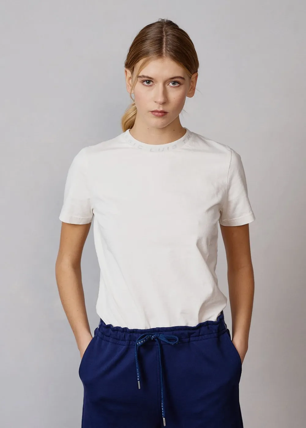 Besonderheiten: Bio-Baumwolle, Ausschnitt im Rippstrick mit Jacquard-Schriftzug - Unser Model Greta ist 1,77 m groß und trägt Größe S.