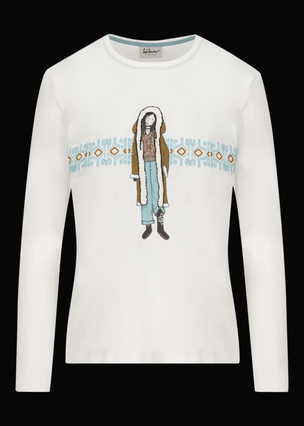 Ausschnitt: Rundhals - Besonderheiten: Extra Tragekomfort, Ethno-Bordüre in Kontrastfarben als Stickerei im Kettenstich an der Brust, weibliche Figur im Stil der Native Americans als Print mit reliefartig gestickten Details