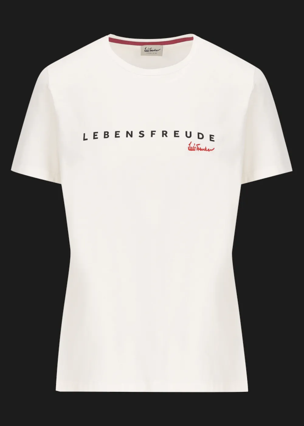 Ausschnitt: Rundhalsausschnitt - Besonderheiten: Extra Tragekomfort, Schriftzug „Lebensfreude“ als Print an der Brust