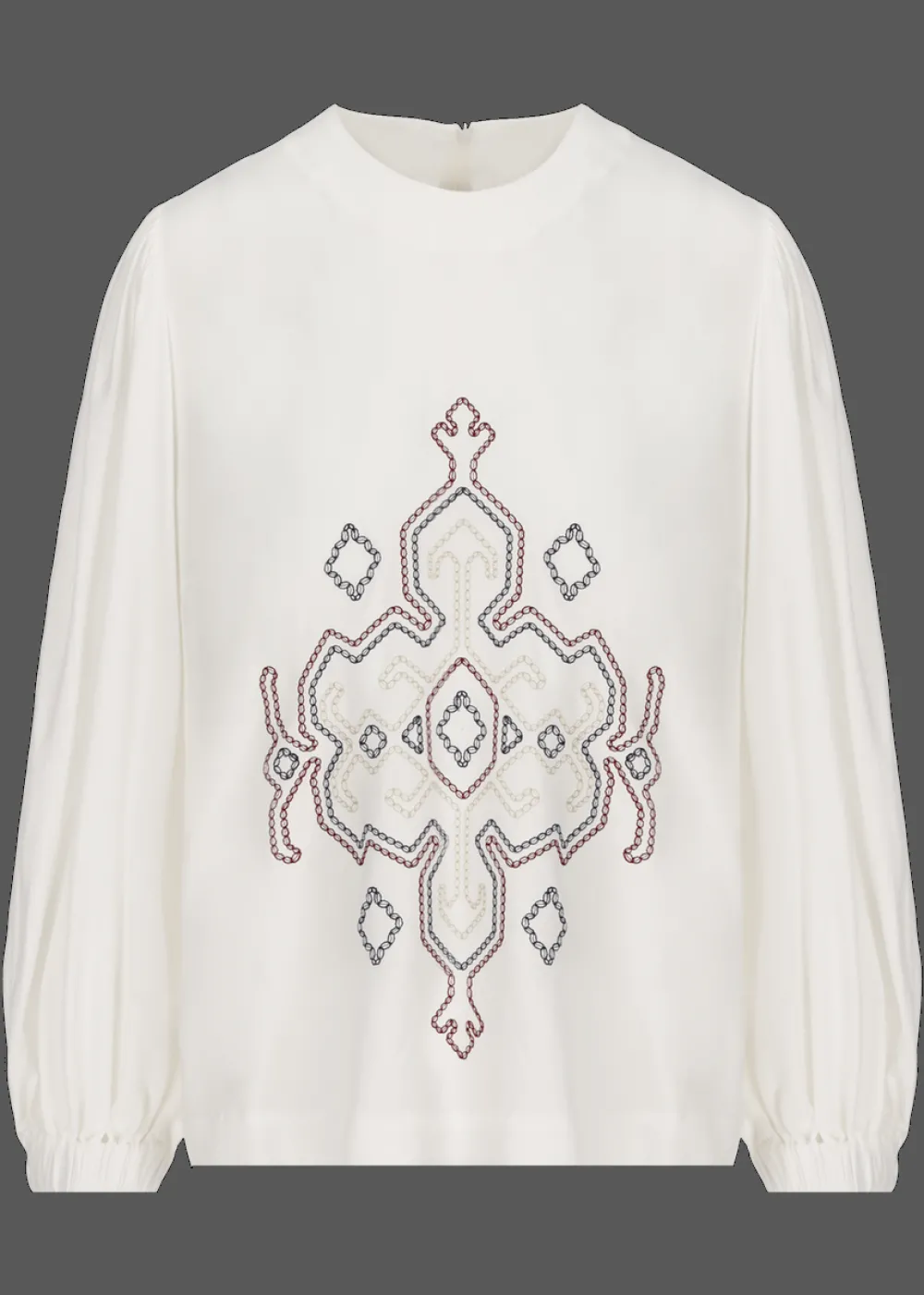 - Diese Bluse im Comfort Fit mit Rundhalsausschnitt besteht aus reiner Viskose und begeistert durch ihr großes gesticktes Ethno-Motiv an der Vorderseite, sowie ihre weiten Ballonärmel mit gerafften Bündchen. Besonders praktisch: ihr Reißverschluss am Rücken.