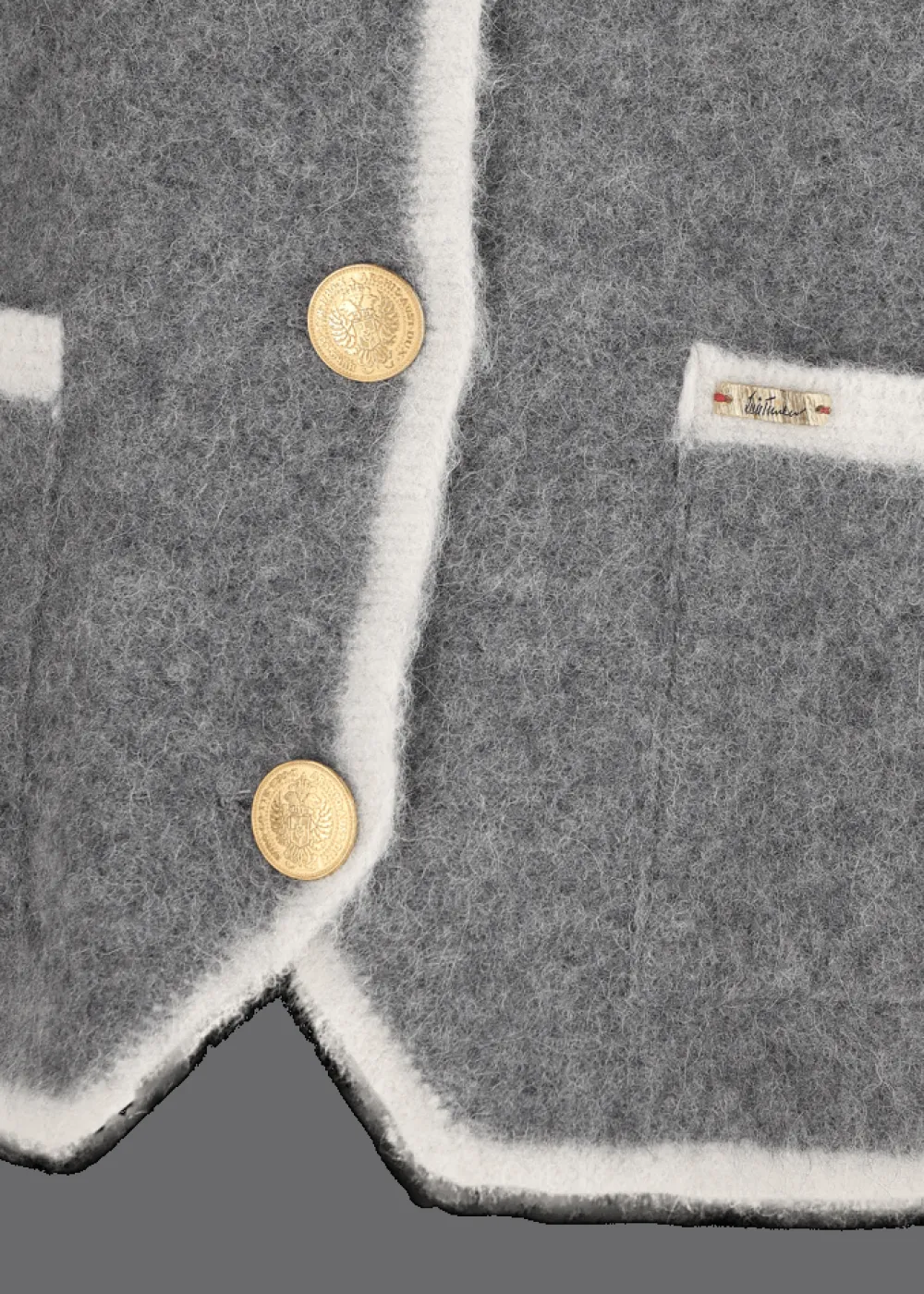 - Diese Outdoor-Walkjacke im Comfort Fit mit Haifischkragen besteht aus einer warmen Mischung aus Alpaka- und Schafwolle. Sie ist eine moderne Interpretation des traditionellen Hofer-Jankers, welcher ab der Mitte des 20. Jahrhunderts in Salzburg auf ganz besondere Weise gefertigt wurde. Ihre von Natur aus windabweisende Funktion, ihre Bordüren in Kontrastfarbe und ihre edlen metallischen Knöpfe machen sie zum Herzstück unserer Outerwear.