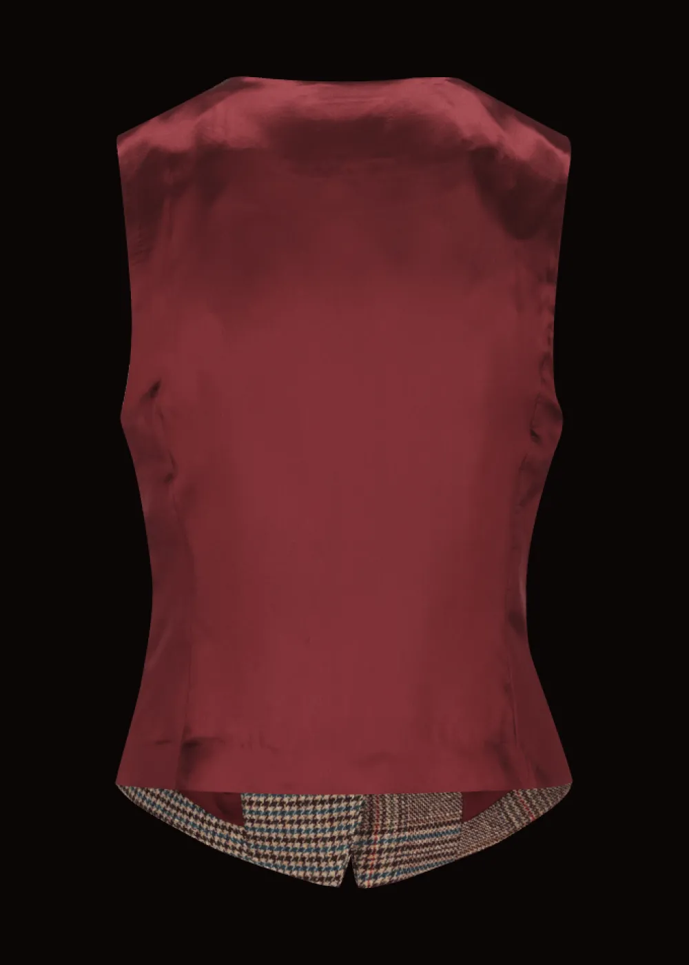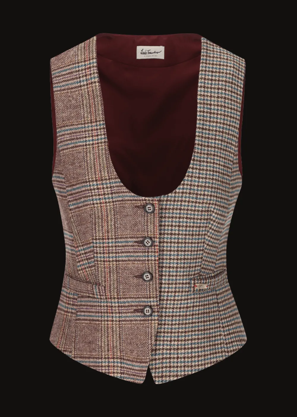 - Diesefigurbetonte Weste im Slim Fit mit U-Ausschnitt, Viskose-Rücken und vier Knöpfen besteht aus einer Wollmischung mit zwei verschiedenen klassischen Mustern: Prince of Wales und Hahnentritt. Der Ausschnitt verlängert Oberkörper, Hals und Gesicht optisch, betont das Decolleté und ist auch für größere Oberweiten geeignet.