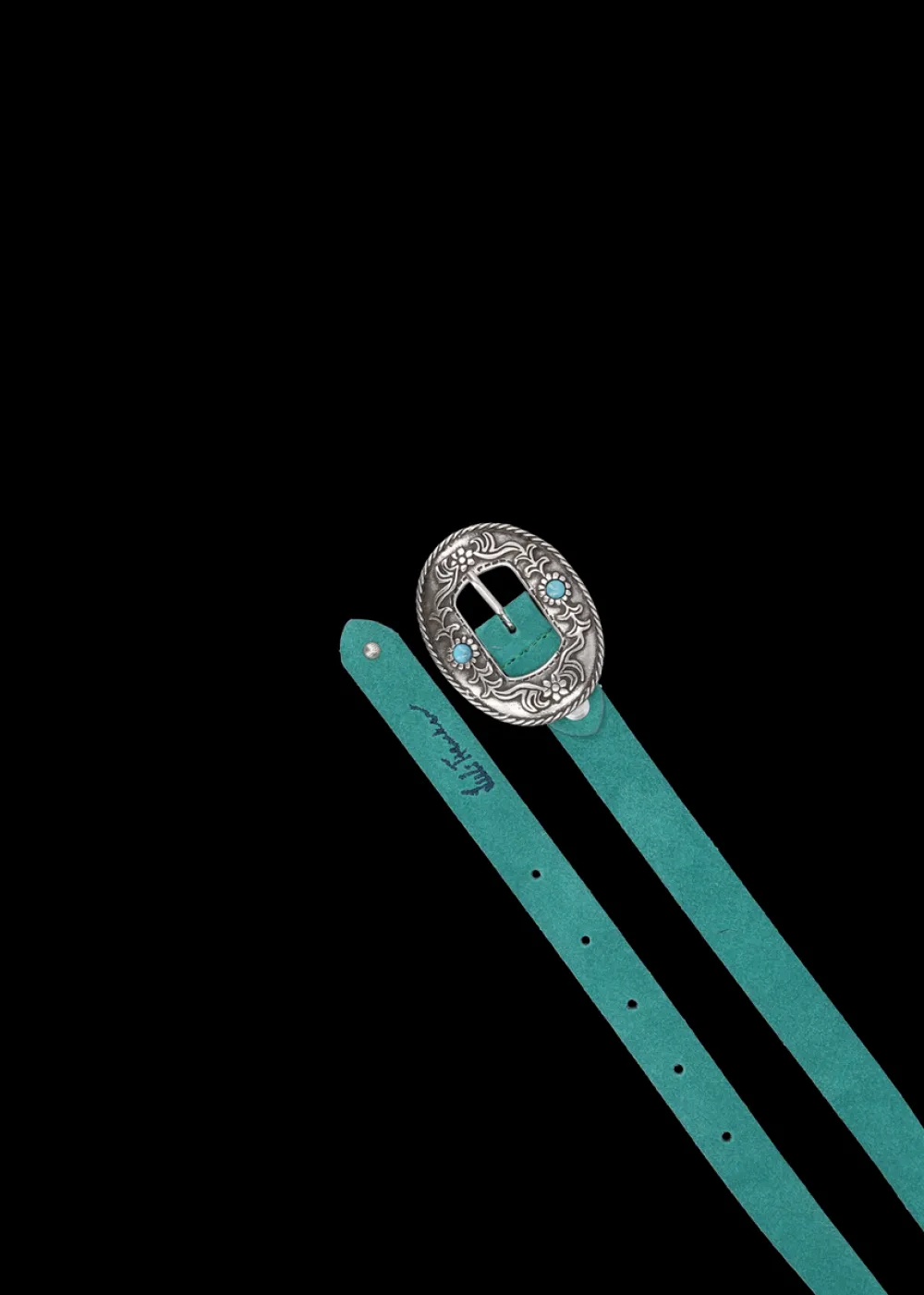 - Dieser schmale Gürtel aus hochwertigem Wildleder mit geprägtem Logo ist dank der massiven metallischen Schnalle mit ornamentalem Blumenmuster und türkisfarbenen Ziersteinen ein echter Hingucker.