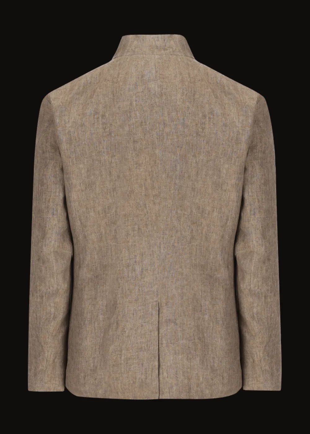 - Dieser in Italien gefertigte Blazer im Regular Fit mit Stehkragen spielt mit zwei verschiedenen Materialien: Rücken und Ärmel bestehen aus reinem Leinen, das Vorderteil hingegen aus ultraleichter Fallschirm-Baumwolle mit extravagantem Muster.