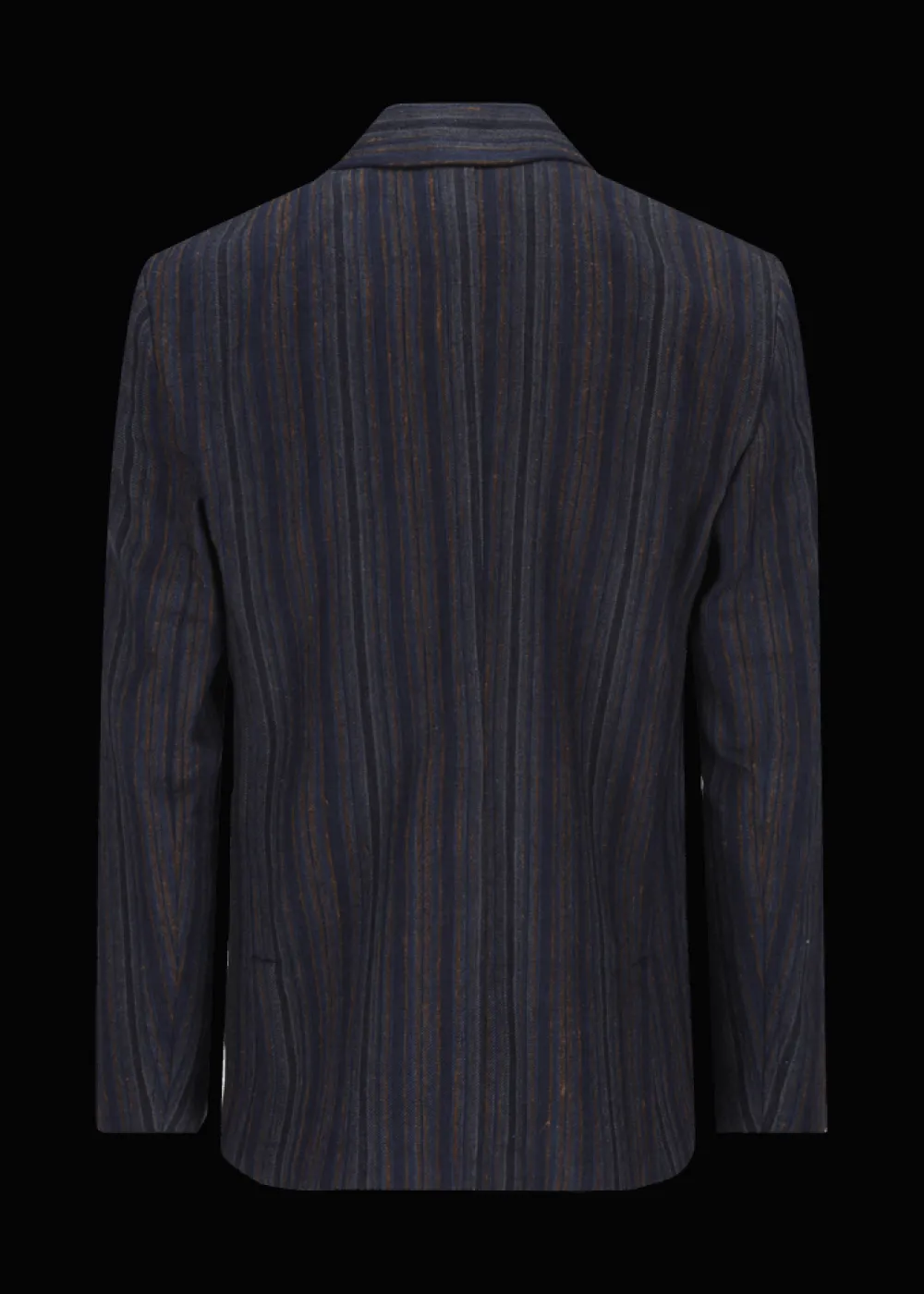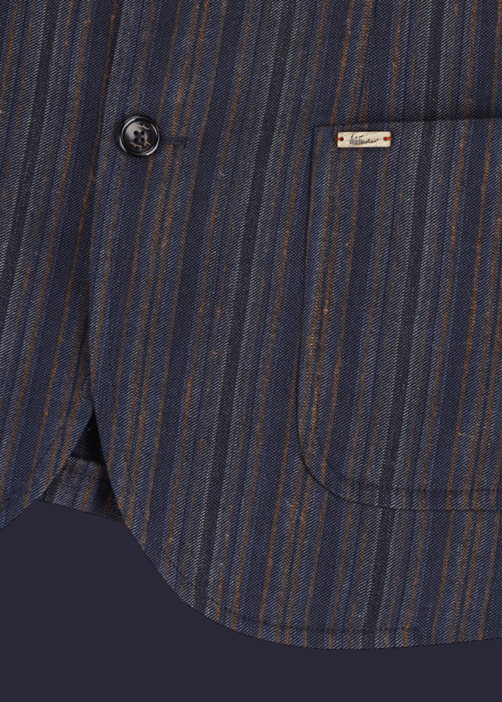- Dieser halbgefütterte, in Italien gefertigte Blazer im Regular Fit mit Reverskragen und drei Knöpfen aus Echthorn besteht aus einer angenehmen Mischung aus Baumwolle, Leinen und Seide mit mehrfarbigen Längsstreifen.