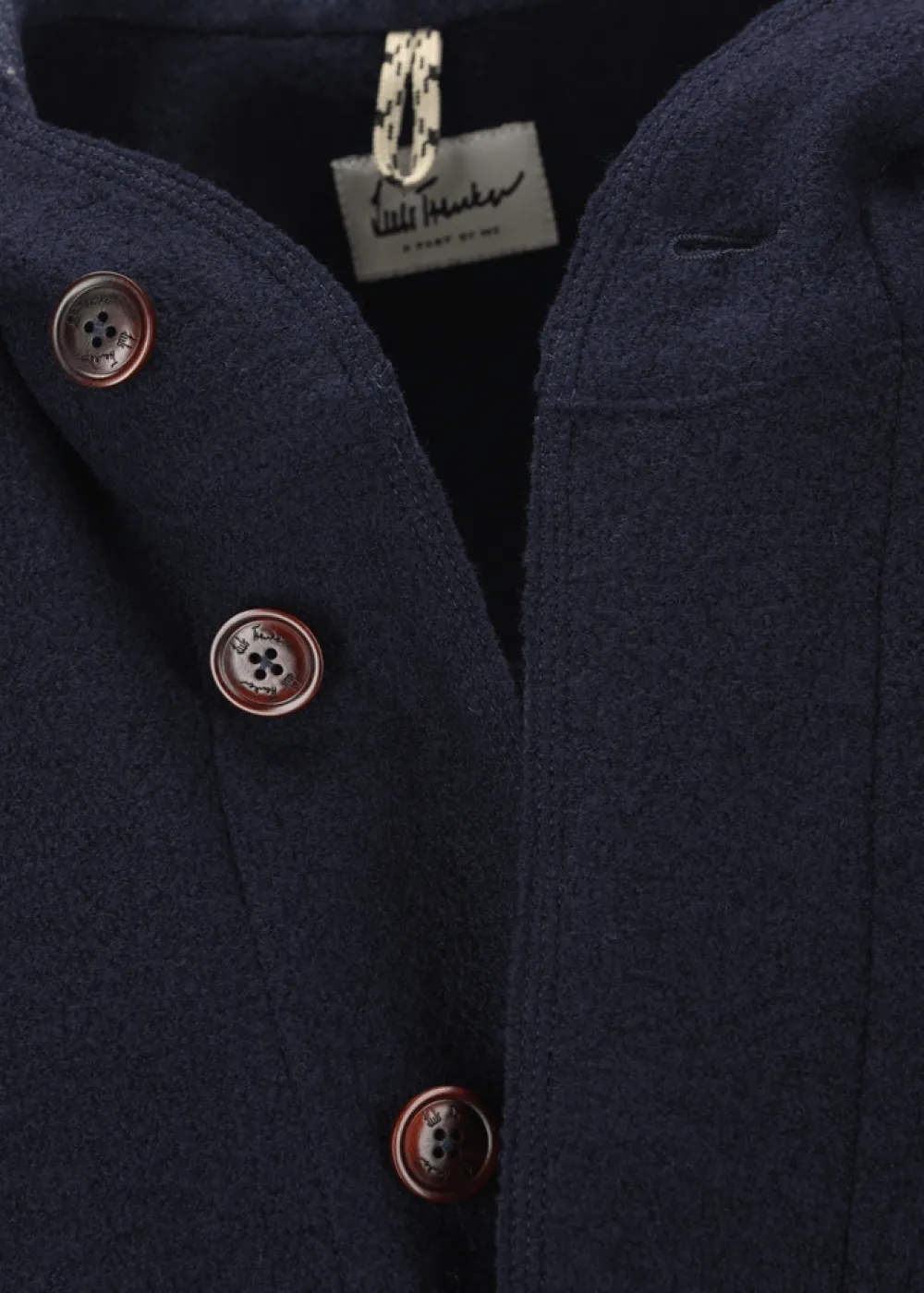 Verschluss: Versteckte Knopfleiste mit Knöpfen aus pflanzlichem Elfenbein (nur der erste Knopf ist sichtbar)