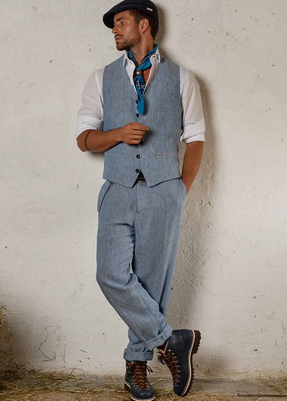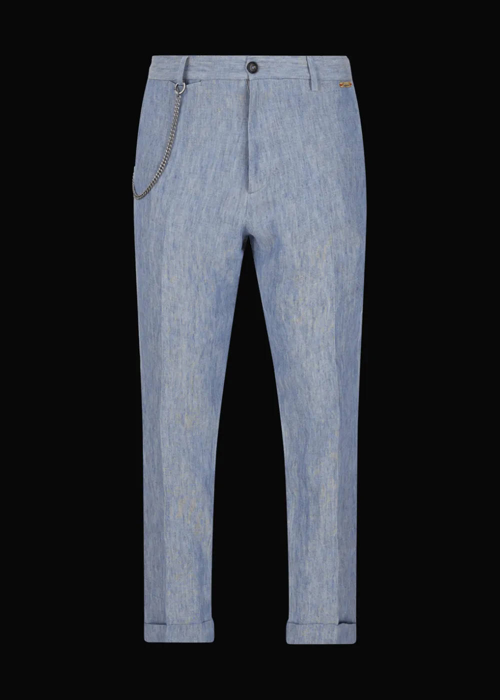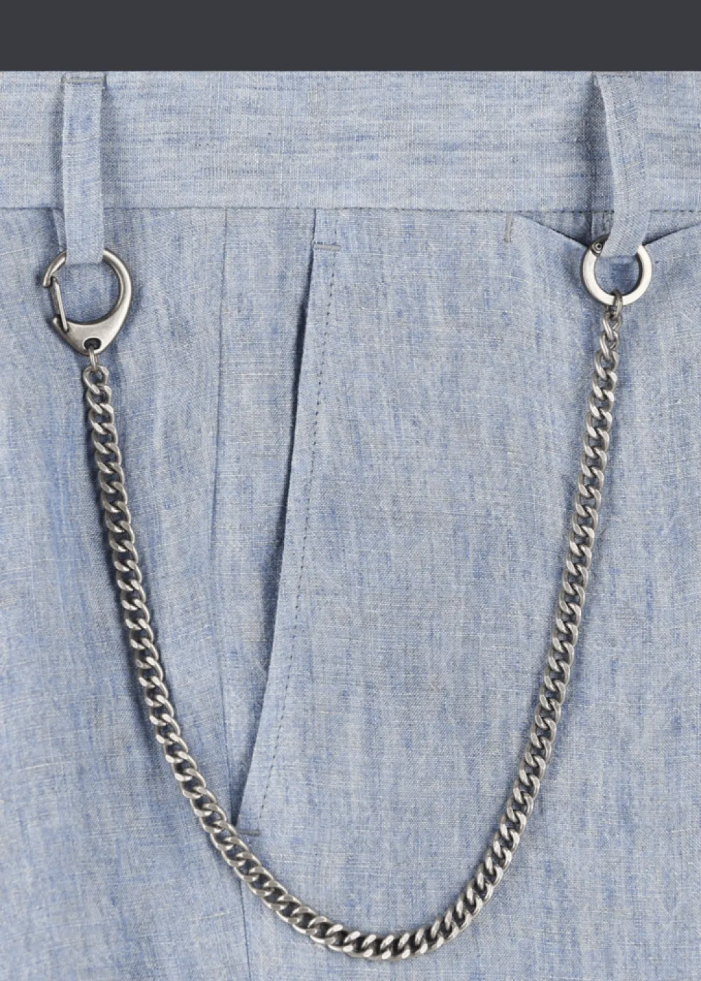Besonderheiten: Knöpfe aus Echthorn, reines Leinen in melierter Optik, abnehmbare Kette als Blickfang an den Gürtelschlaufen, Bügelfalte, Saumumschlag - Unser Model Valentin ist 1,82 m groß und trägt Größe 50.