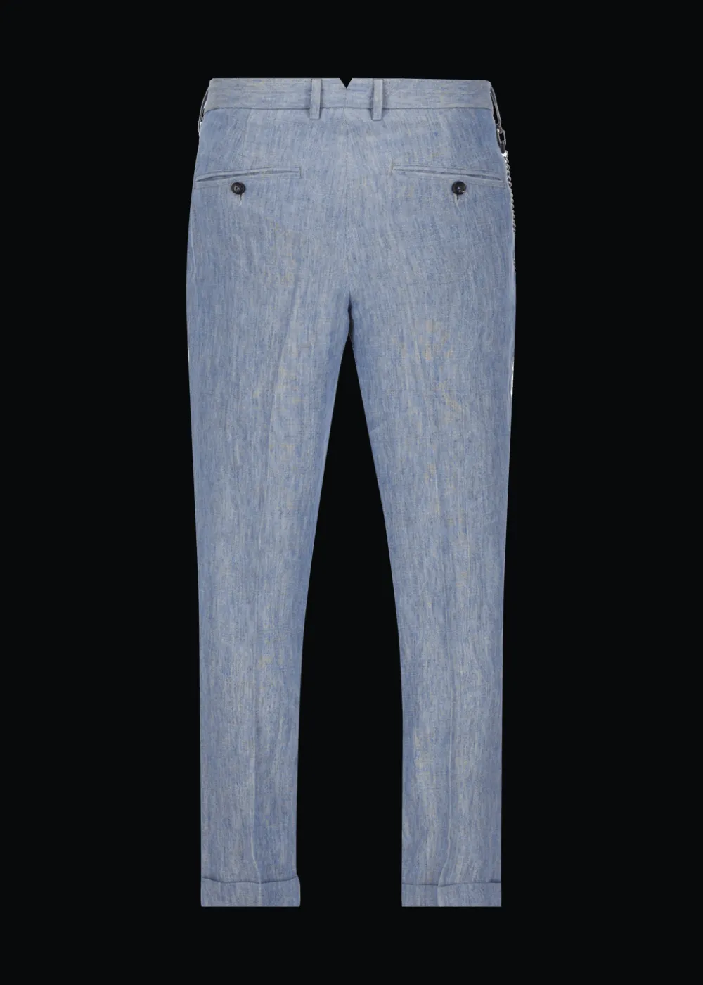 - Diese lange Hose im Regular Fit mit etwas weiterem Bein, Bügelfalte und Saumumschlag besteht aus reinem Leinen mit Melange-Effekt. Ihre abnehmbare dekorative Kette an den Gürtelschlaufen ist ein originelles Detail, welches dieses Modell auszeichnet.