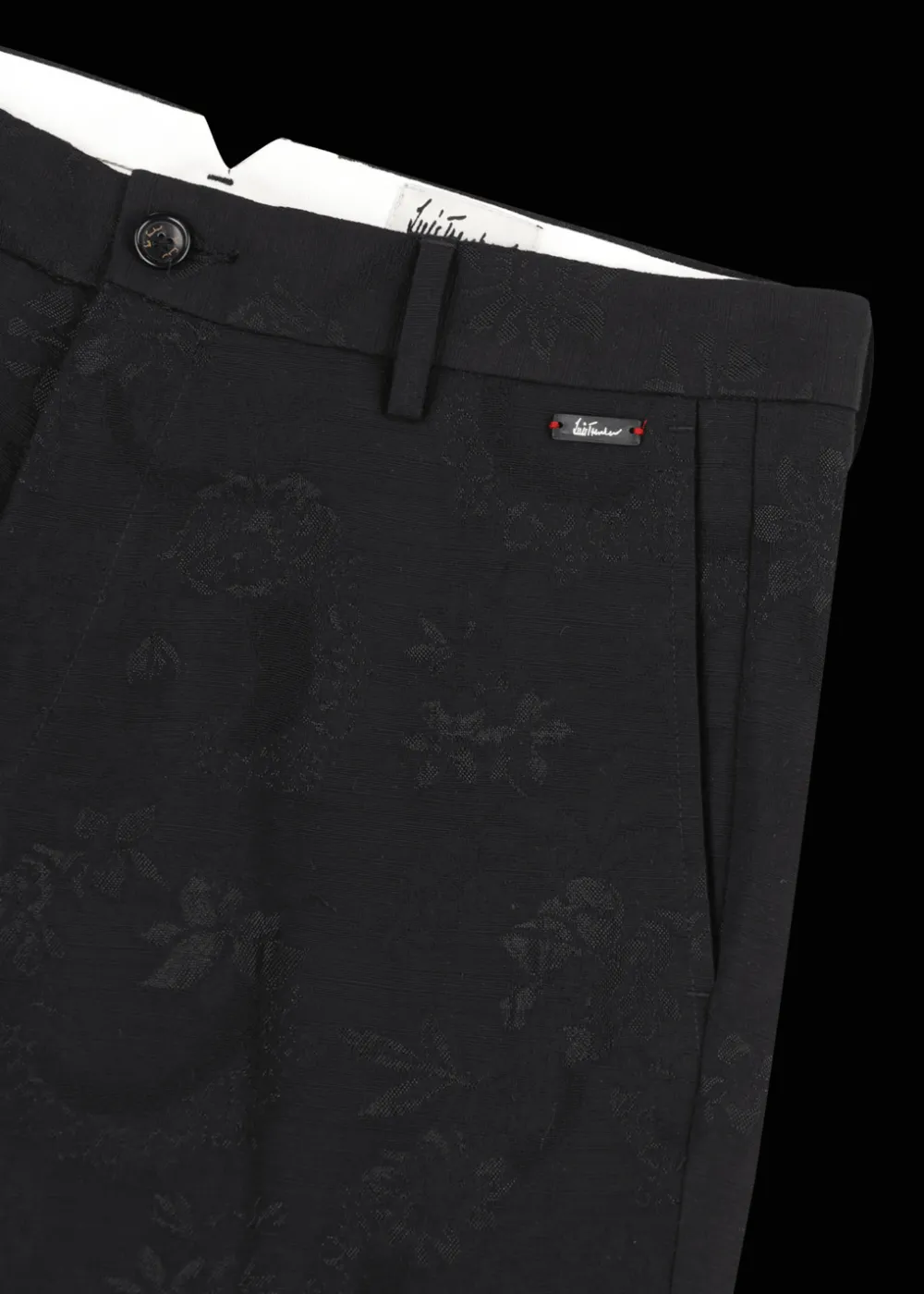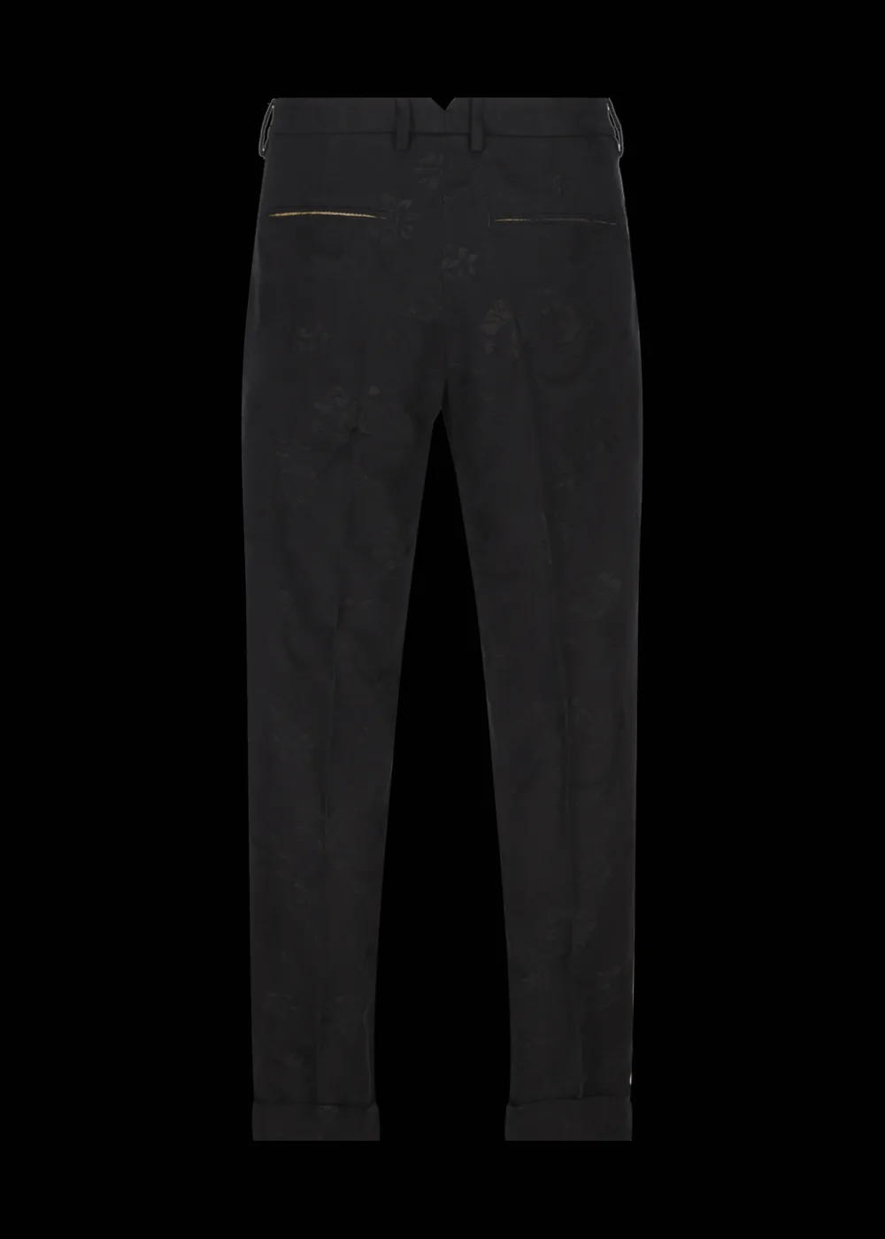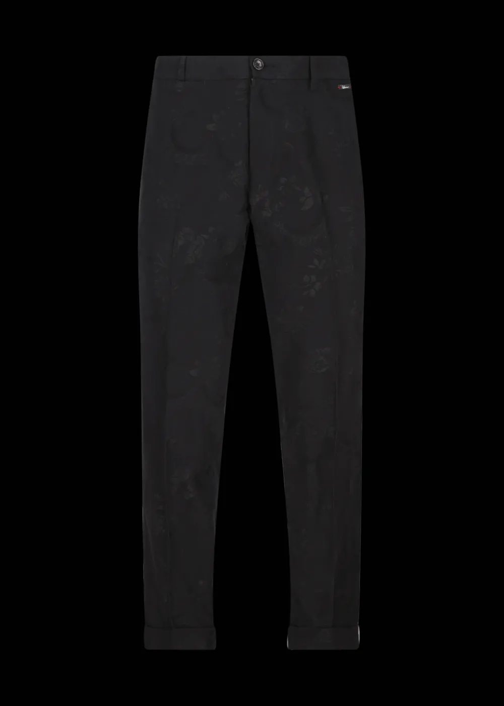 - Diese in Italien gefertigte lange Hose im Regular Fit mit etwas weiterem Bein und Saumumschlag besteht aus einer angenehmen Baumwoll-Viskose-Mischung in elegantem Schwarz mit Jacquard-Blumenmuster im selben Farbton.