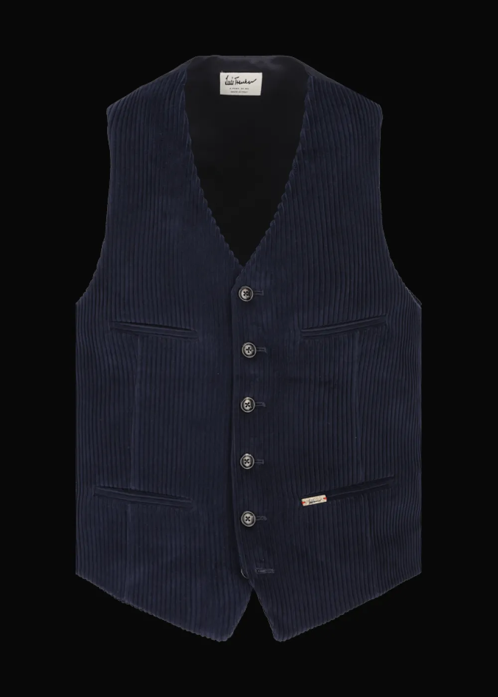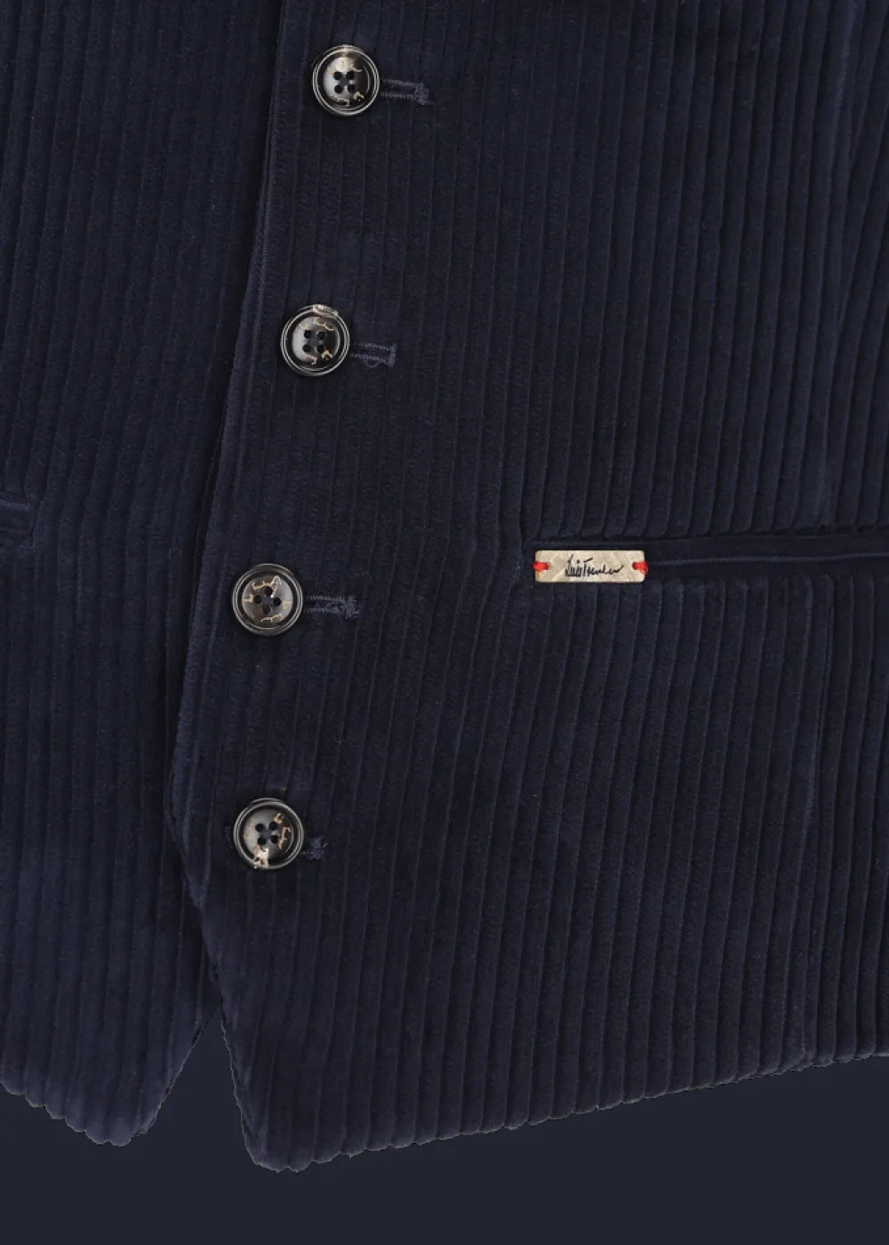 - Diese in Italien gefertigte, einreihige Weste im Regular Fit mit V-Ausschnitt aus reinem Baumwollcord ist am Rücken, der aus glatter Baumwolle besteht, in der Weite regulierbar. Sie hat eine einreihige 6-Button-Front mit Knöpfen aus Echthorn, sowie vier Leistentaschen.