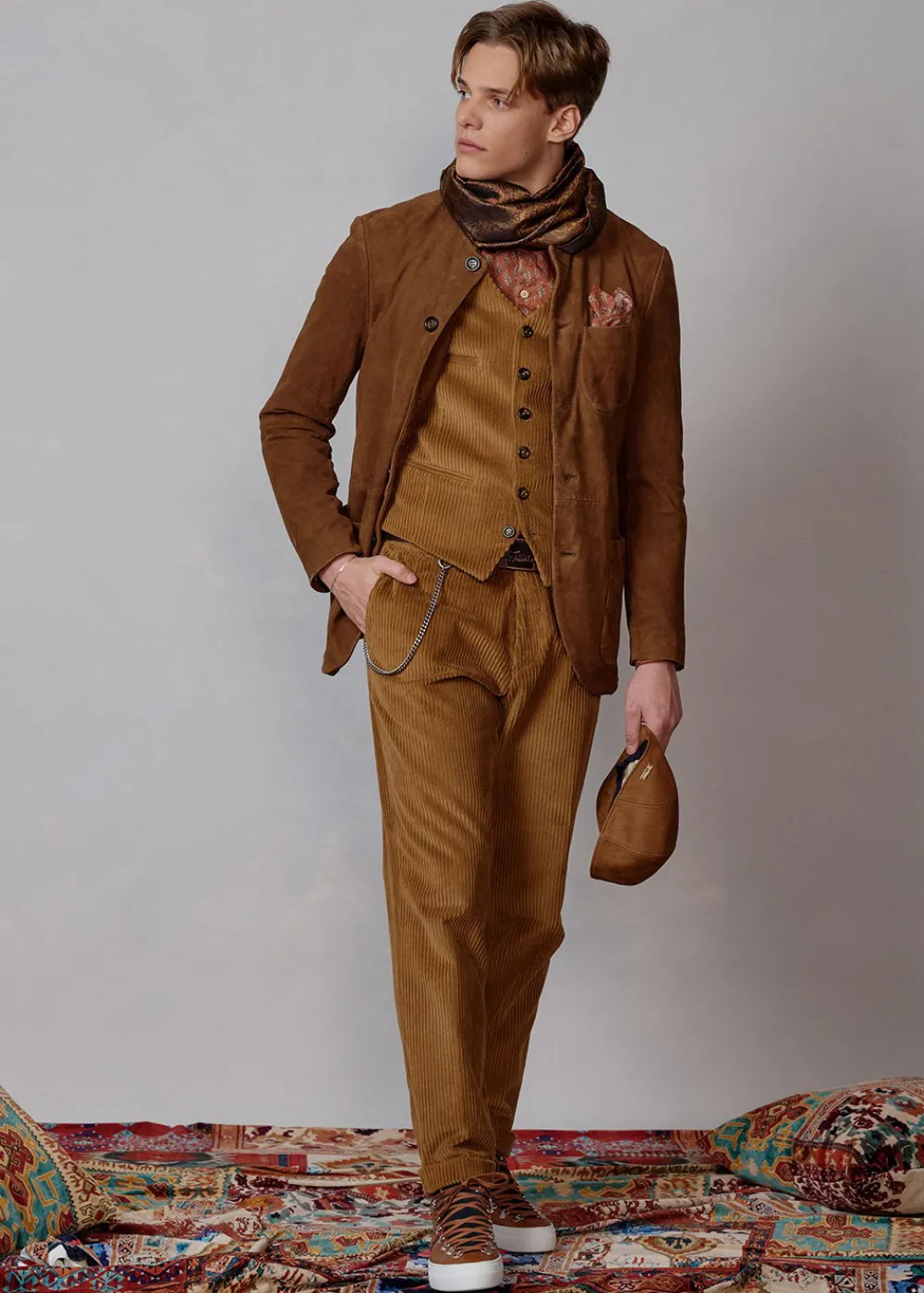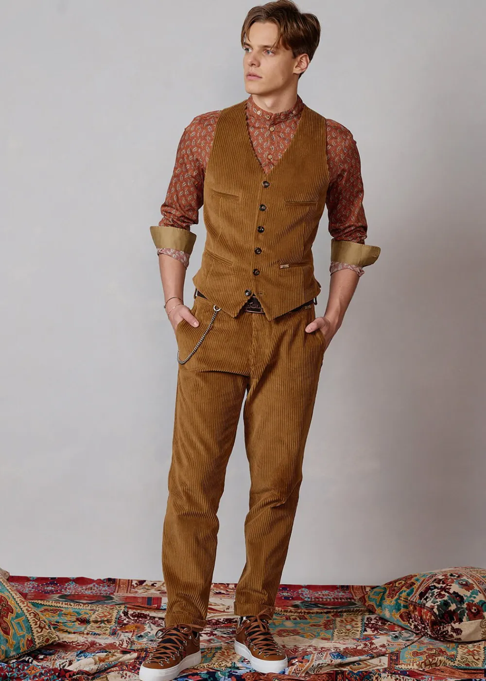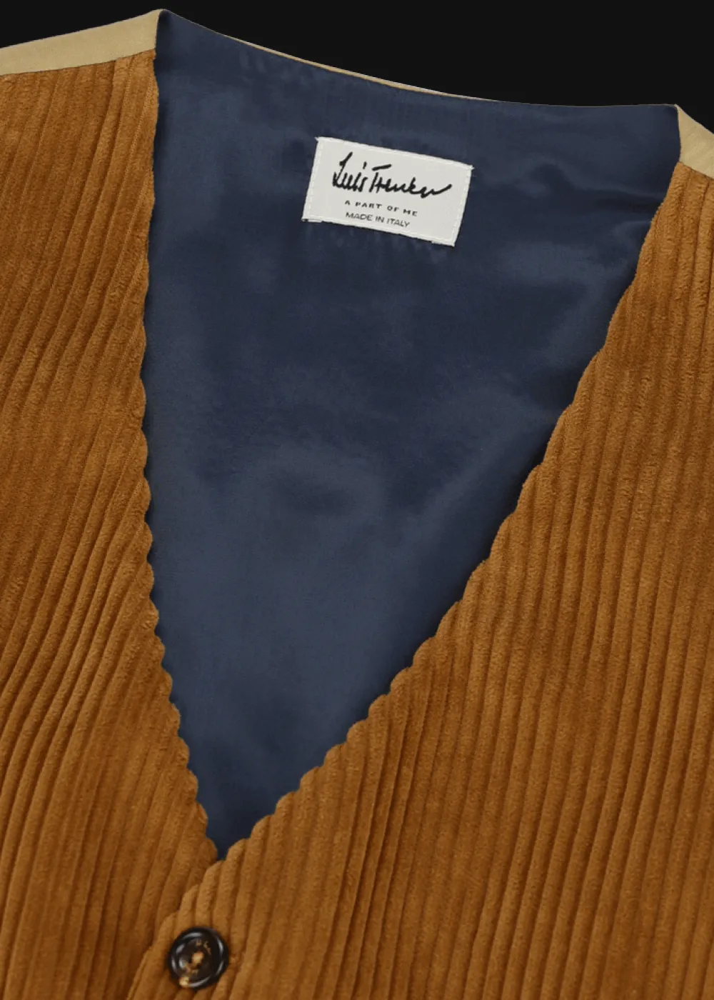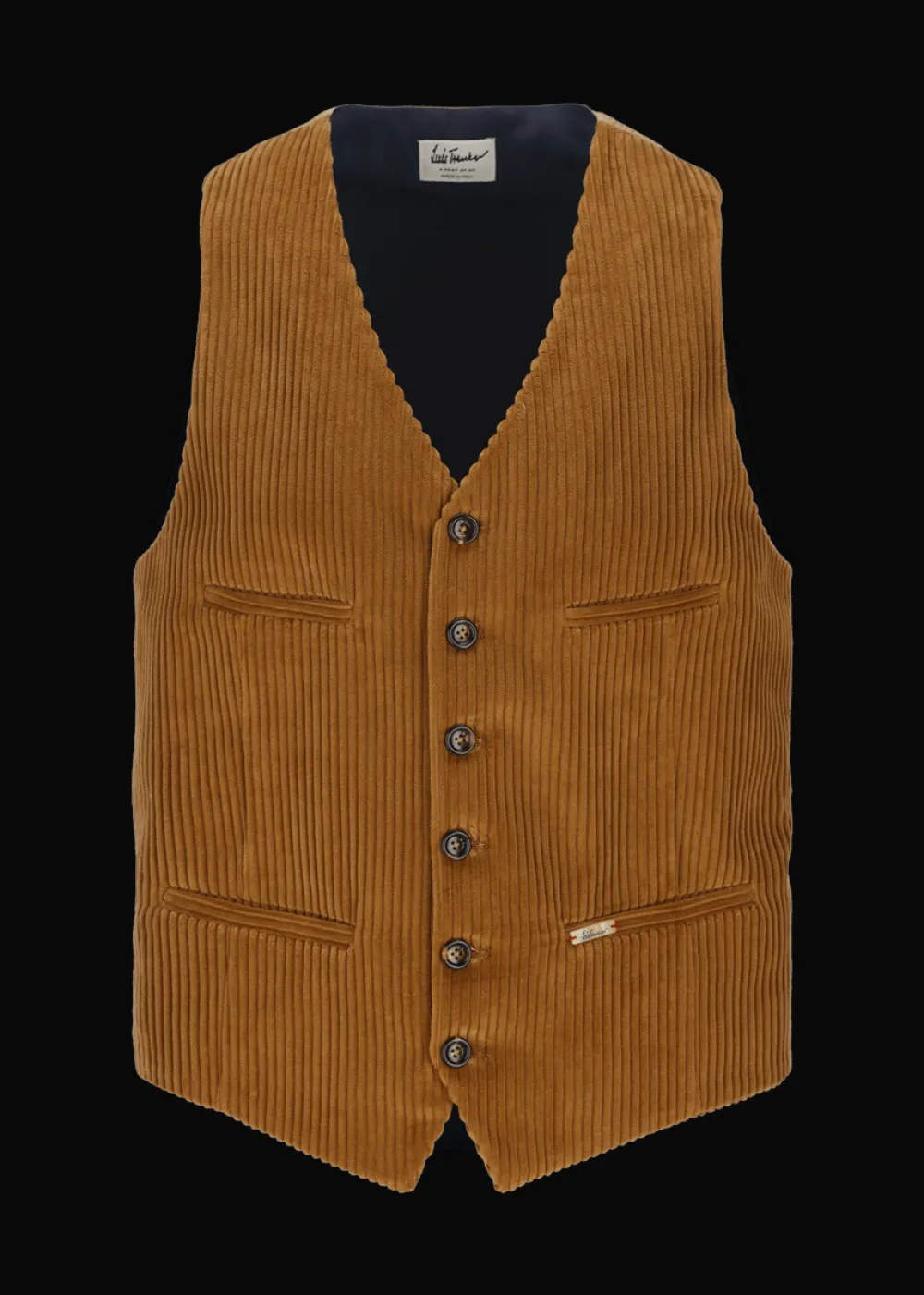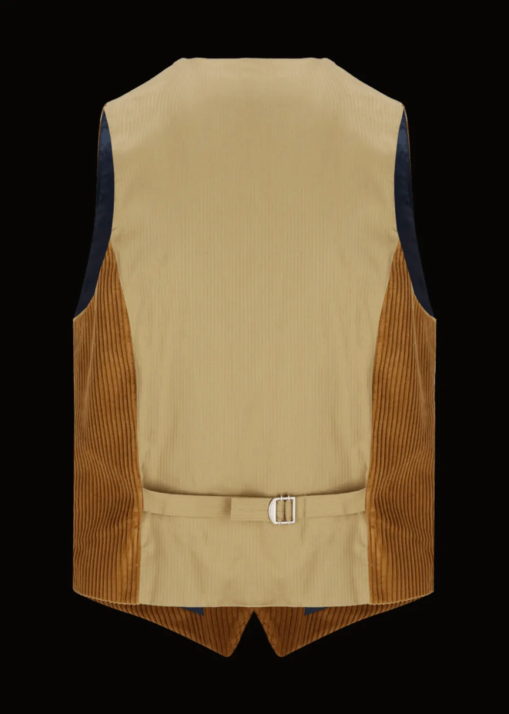 - Diese einreihige Weste im Regular Fit mit V-Ausschnitt aus reinem Baumwollcord ist am Rücken, der aus Baumwolle mit Fischgrätmuster besteht, in der Weite regulierbar. Sie hat eine einreihige 6-Button-Front mit Knöpfen aus Echthorn, sowie vier Paspeltaschen.