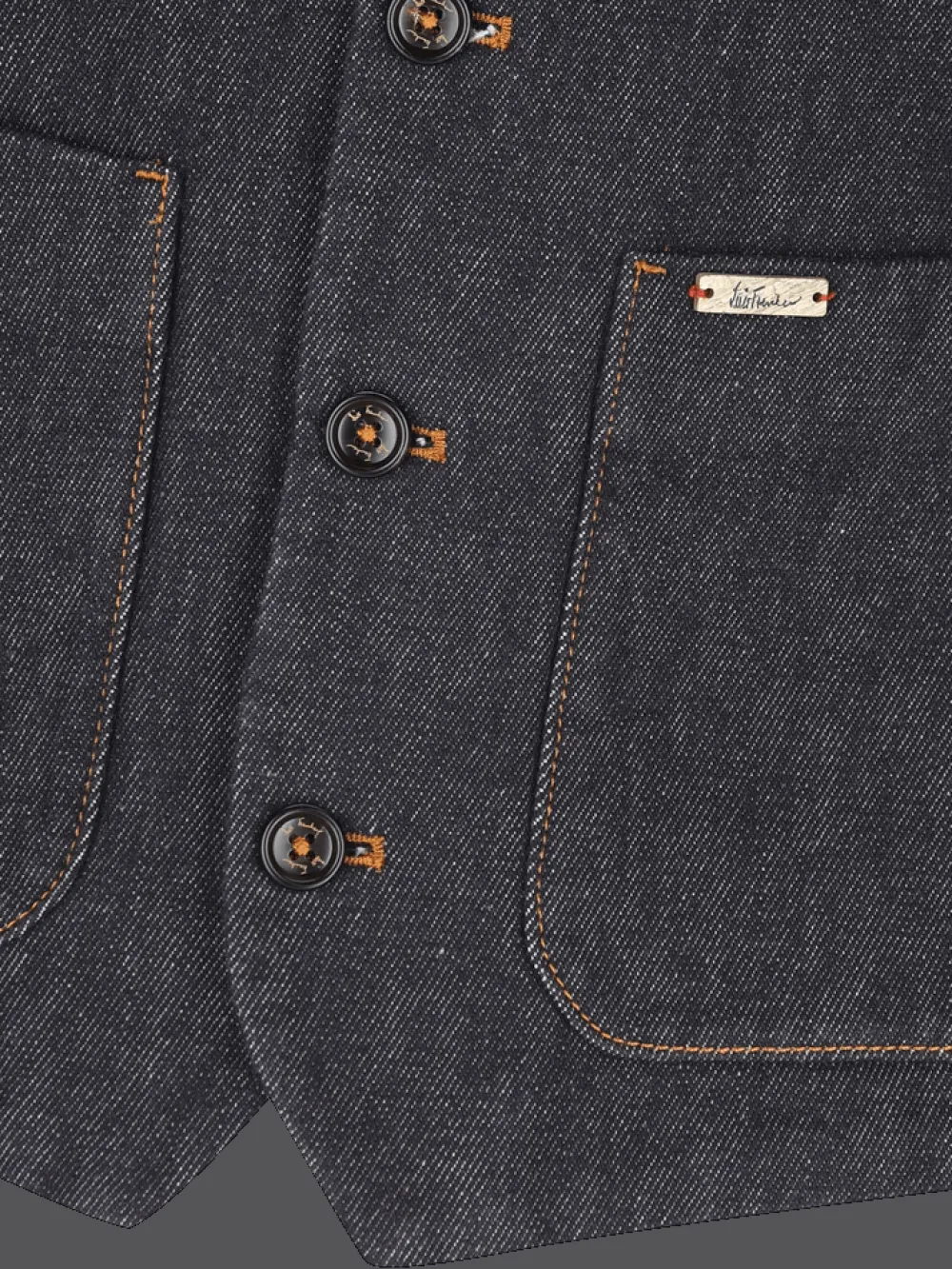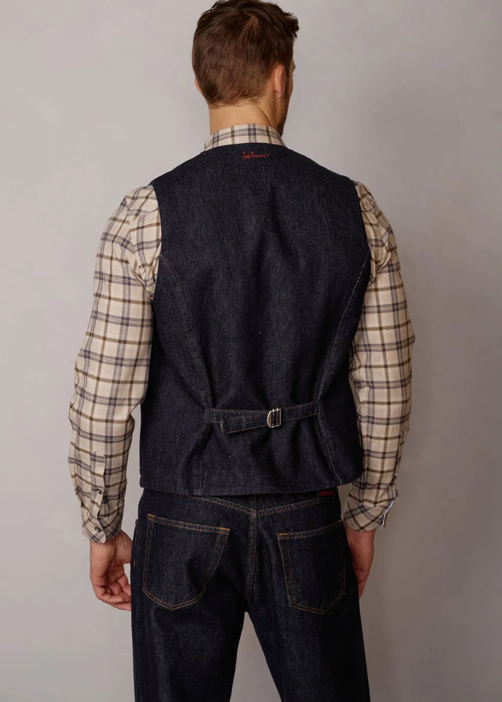 Besonderheiten: Recyceltes Denim, gefärbt mit echtem Indigo, Baumwollfutter mit verschiedenen originellen Mustern, durch Schnalle am Rücken in der Weite regulierbar, kleine Logostickerei in Kontrastfarbe hinten am Ausschnitt, Logoplakette in Hornoptik an der linken Tasche - Unser Model Federico ist 1,88 m groß und trägt Größe 50.
