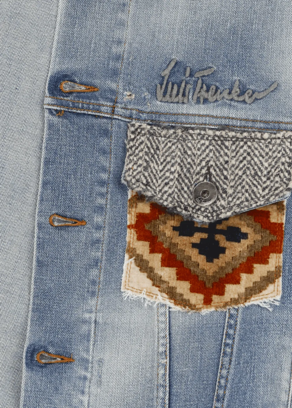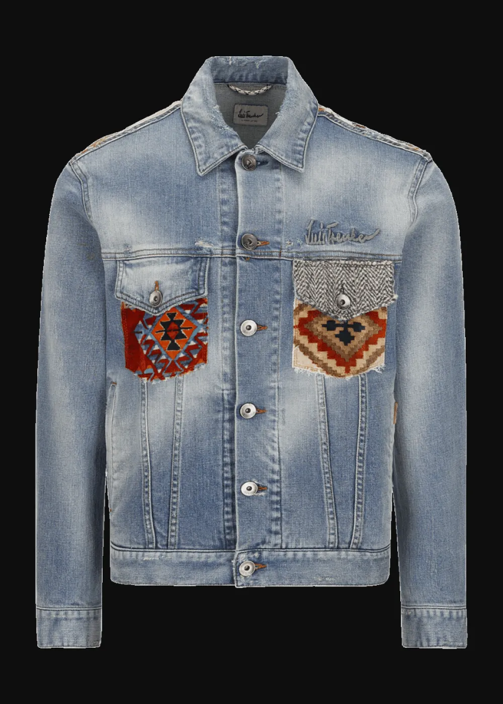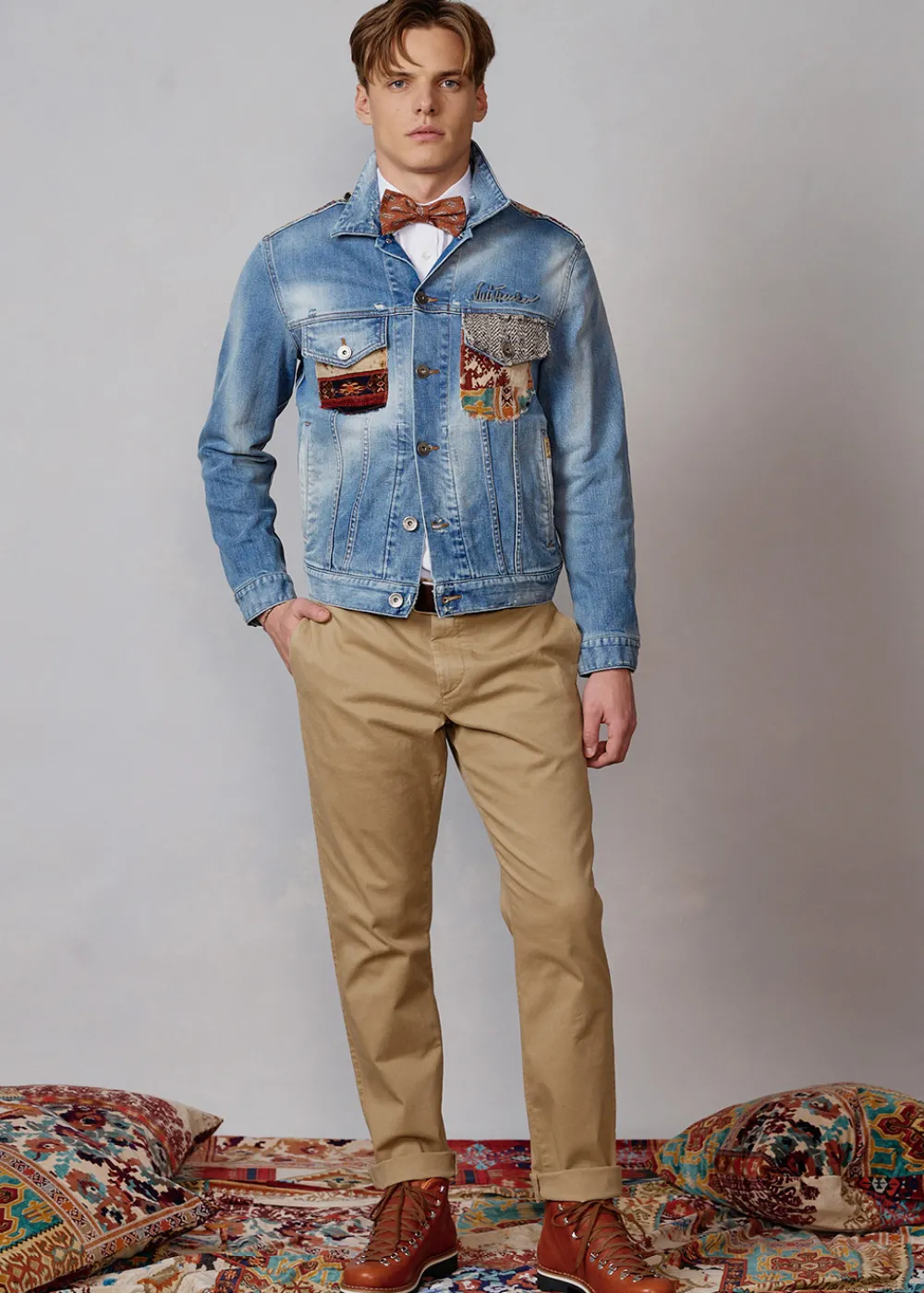 Besonderheiten: Samt mit exklusiv für Luis Trenker entworfenem Patchwork-Print an Brusttaschen und hinterem Schulterbereich, Klappe aus Kontraststoff mit Fischgrätmuster an der linken Brusttasche, leicht abgewetzte Stellen für einen gewollten Used Look