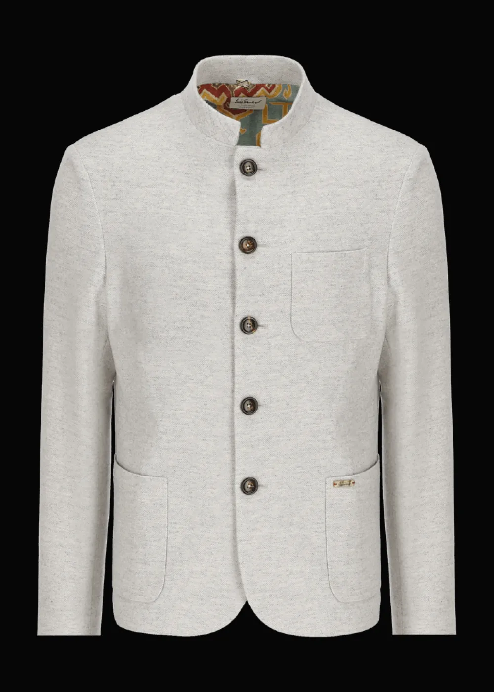 - Dieser halbgefütterte Blazer im Regular Fit mit Stehkragen besteht aus einer angenehm weichen Schurwollmischung mit Fischgrätmuster. Das Innenfutter im Schulterbereich ist durch seinen Ethno-Print, der exklusiv für Luis Trenker designt wurde, ein echter Eyecatcher.