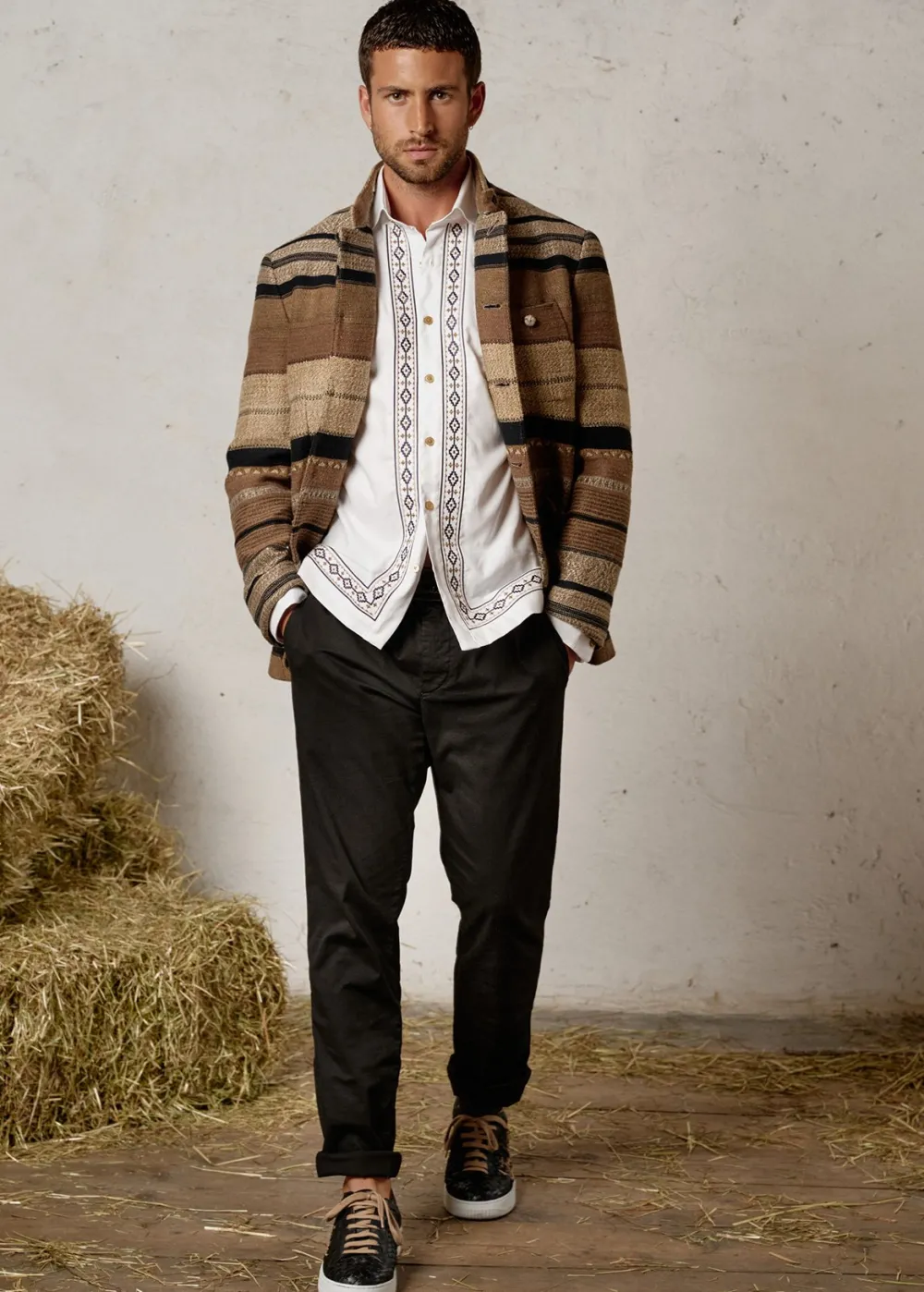 Besonderheiten: Aufwändige Stickerei im Ethno-Stil entlang von Knopfleiste und Saum, kleines gesticktes Luis Trenker Logo an der linken Brust - Unser Model Valentin ist 1,82 m groß und trägt Größe L.