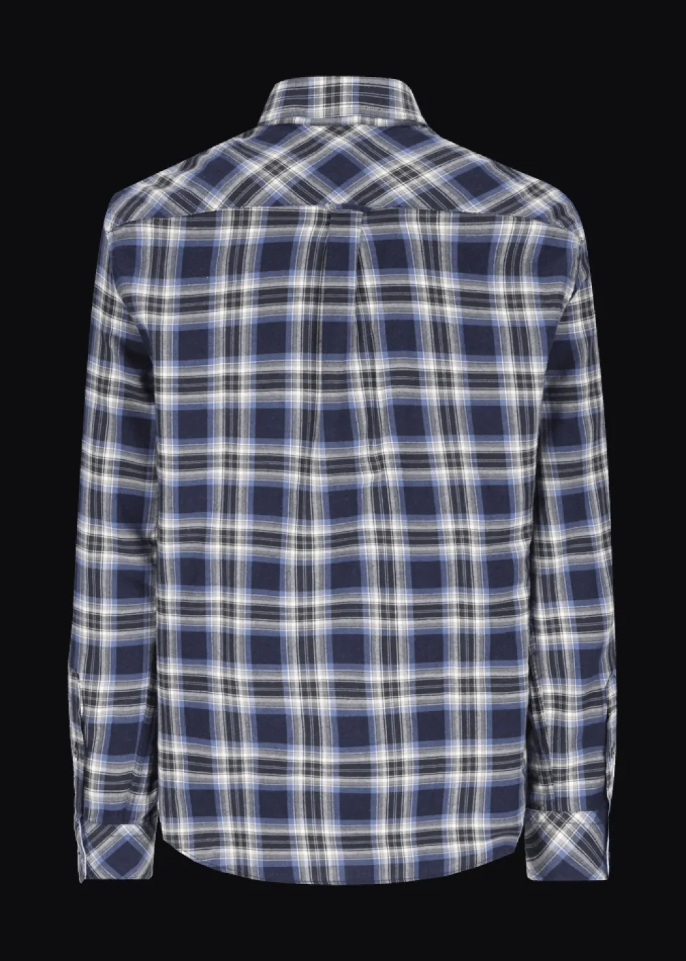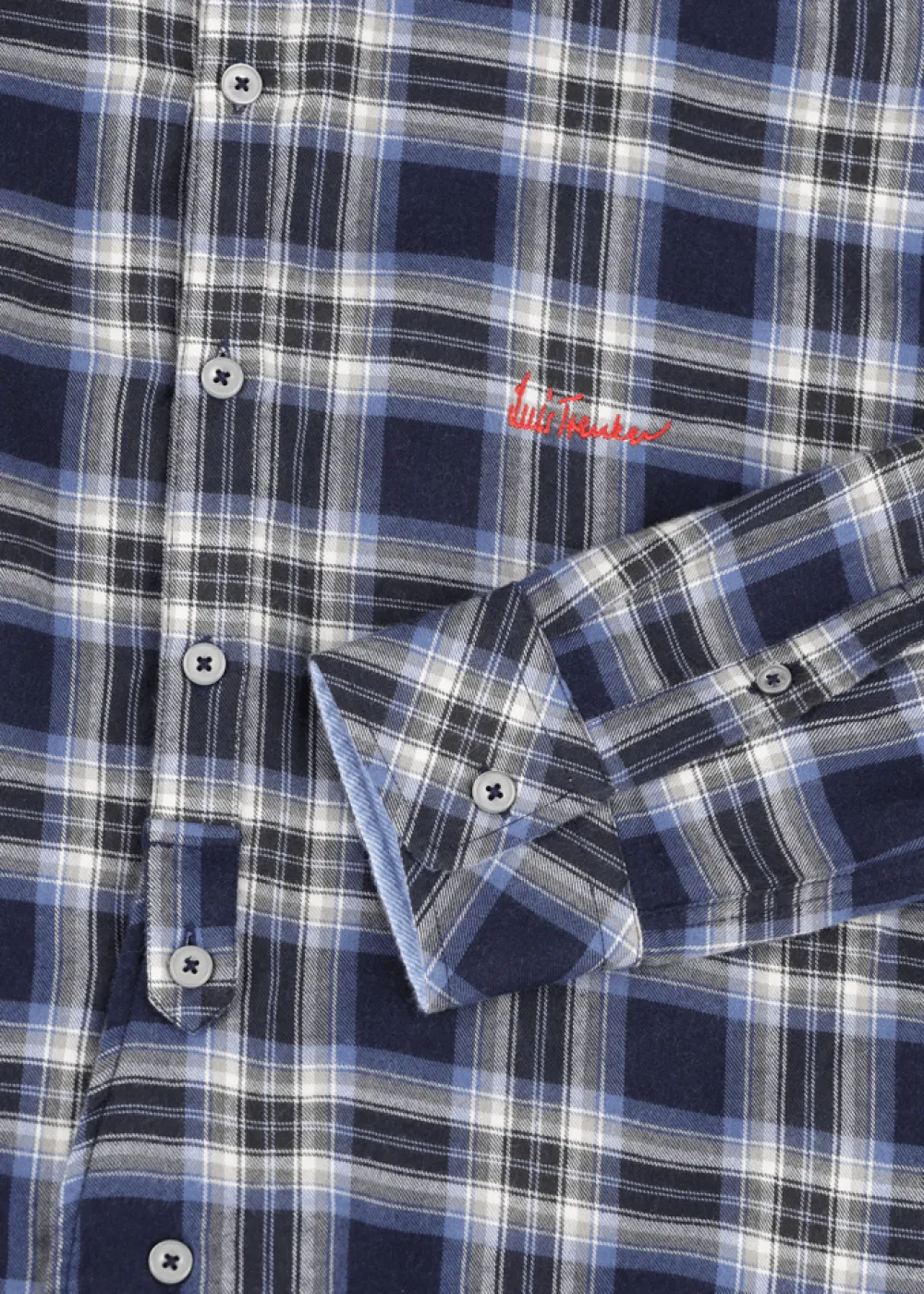 Knopfleiste: Durchgehende Knopfleiste - Besonderheiten: Dezente Kontraste aus hellblauem Strukturstoff, gesticktes Luis Trenker Logo, Stickerei „Der Berg ruft“ innen an der Manschette